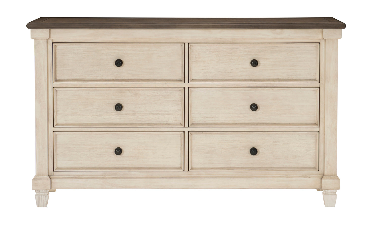 The weaver collection is an excellent example of how the transitional-rustic style may be successfully executed in furniture design. the plank-style tops are finished in a rosy brown, and antique white offers a striking contrast to this color. pine solids and oak veneer also contribute further visual texture to the dresser. the rustic design is finished off with traditional frame and hardware that has dark metal knobs.