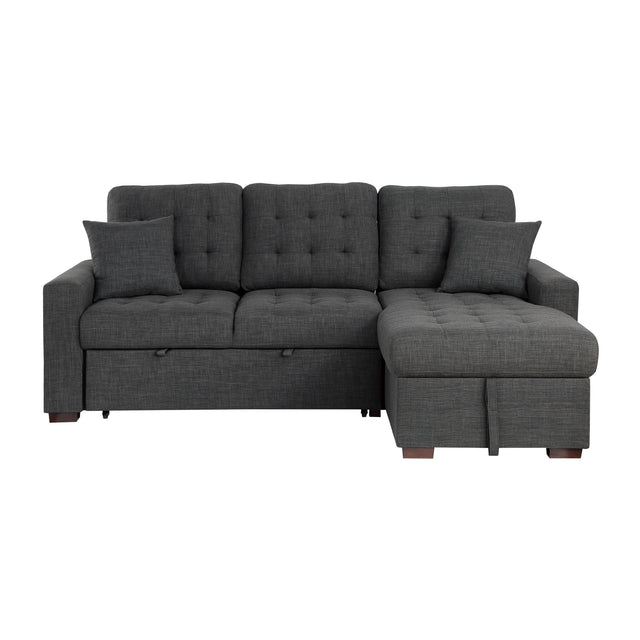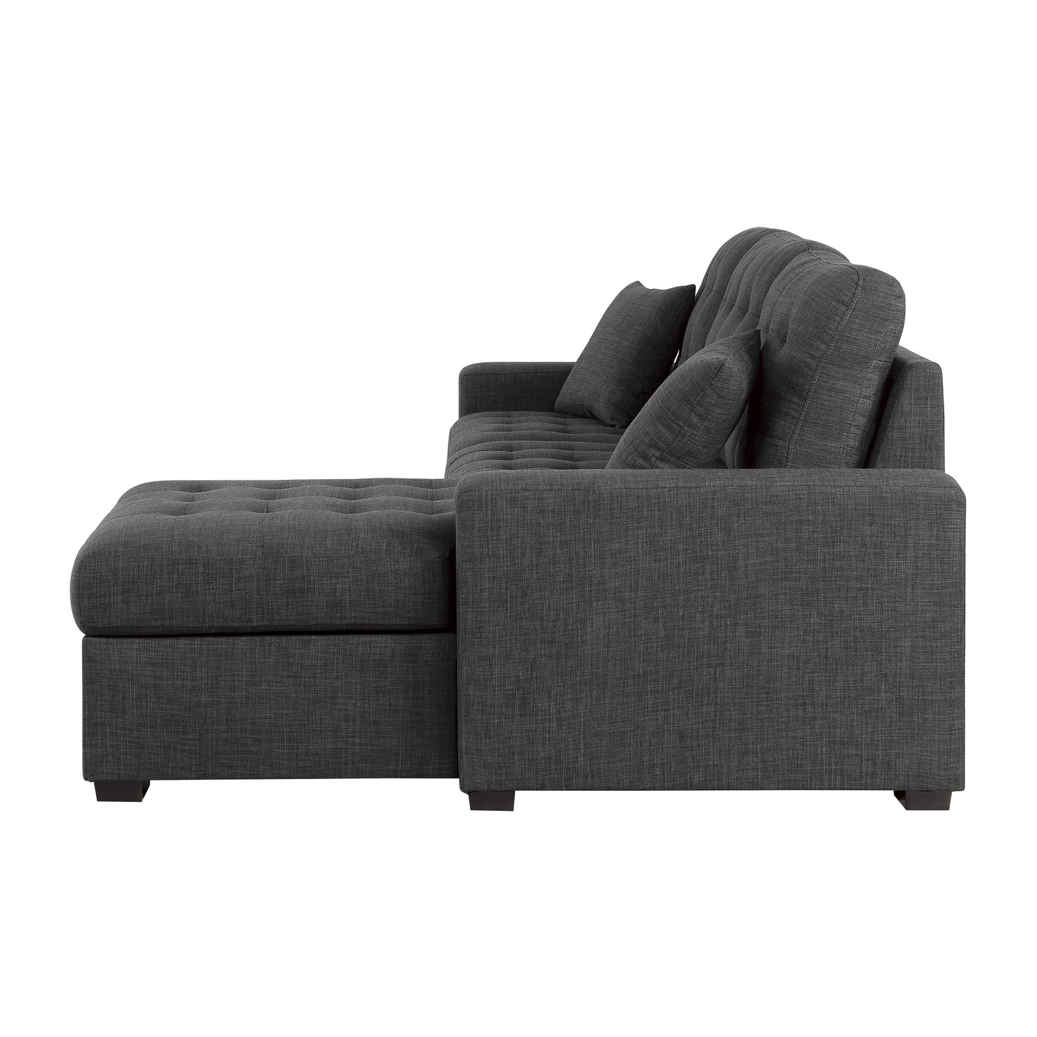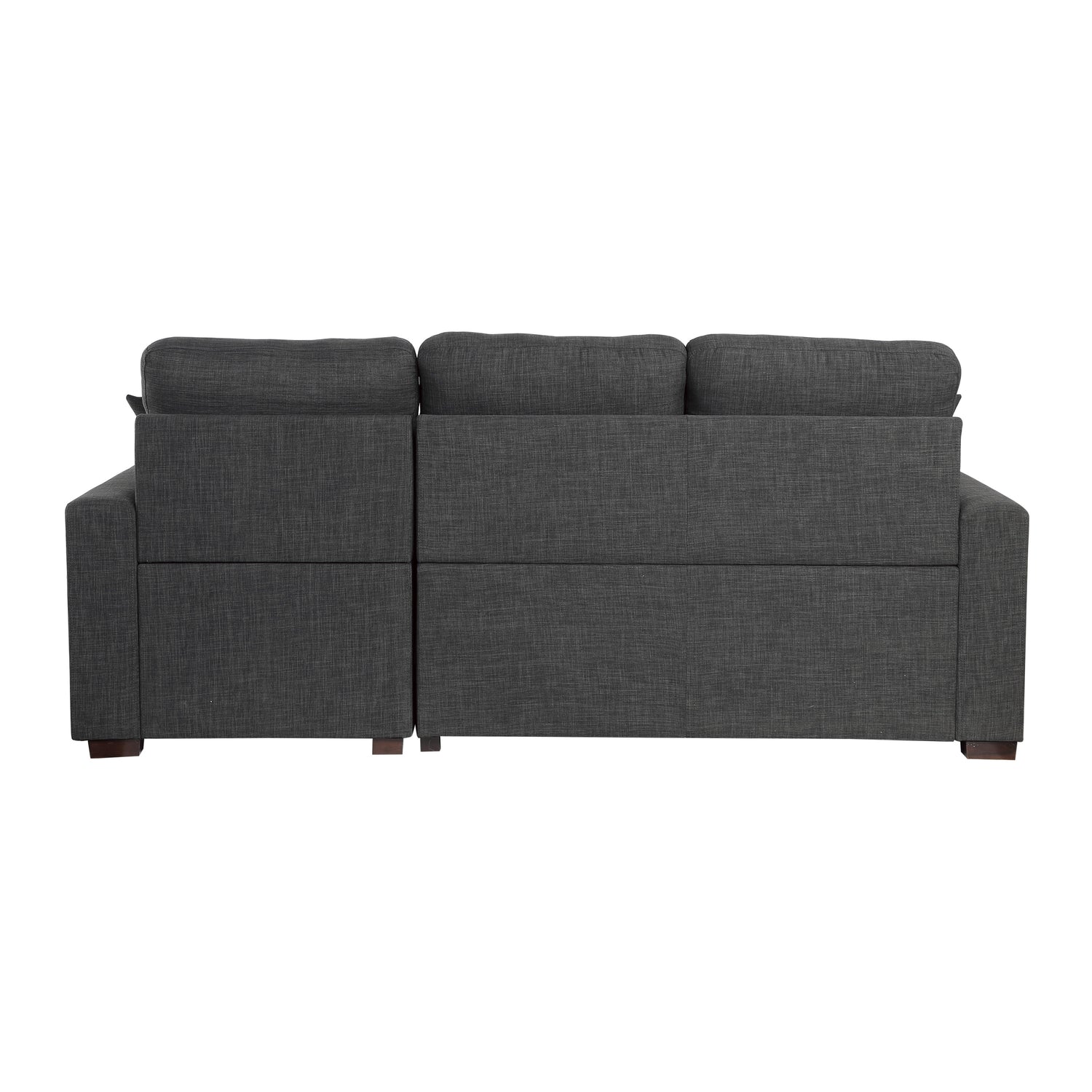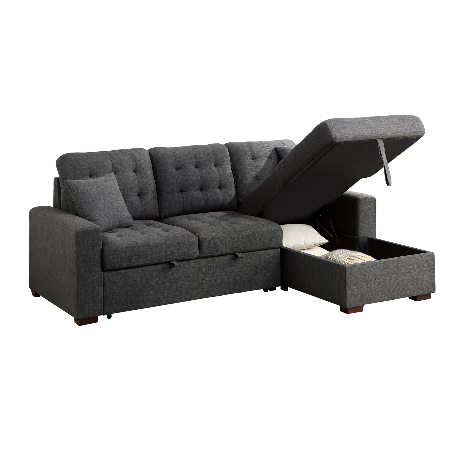 The mccafferty collection features versatile and utilitarian pieces that go above and beyond the capabilities of a conventional sofa. this chair group features a transitional profile that is accented by stitch tufting and track-style arms and is covered in a fabric that is a dark gray color. a pull-out trundle can be found neatly tucked away beneath the sofa, and when it is raised, it may be used as a bed. additionally, the top of the linked chaise can be opened to reveal storage space beneath the seat.