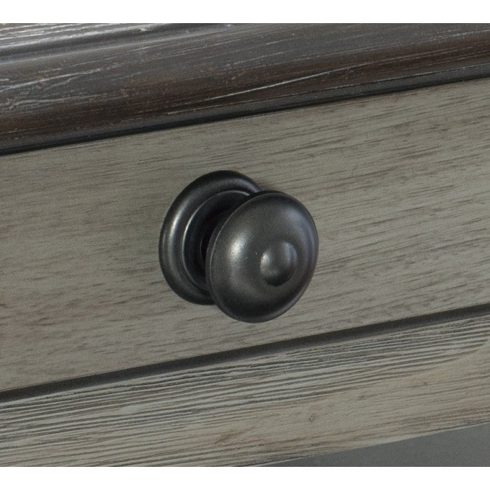 Inspired by the aesthetic of a casual country kitchen, the Granby Collection is an inviting gathering spot for mealtime with family and friends. The 36-inch counter height table features 4 drawers on the apron and a storage display shelf base with wine rack. The two-tone look of the acacia and pine solids base, finished in antique gray, and the oak veneer of the coffee-finished tabletop, present as a harmonious combination of color, perfect for your home. The drawers on the table apron feature dark metal knob hardware.