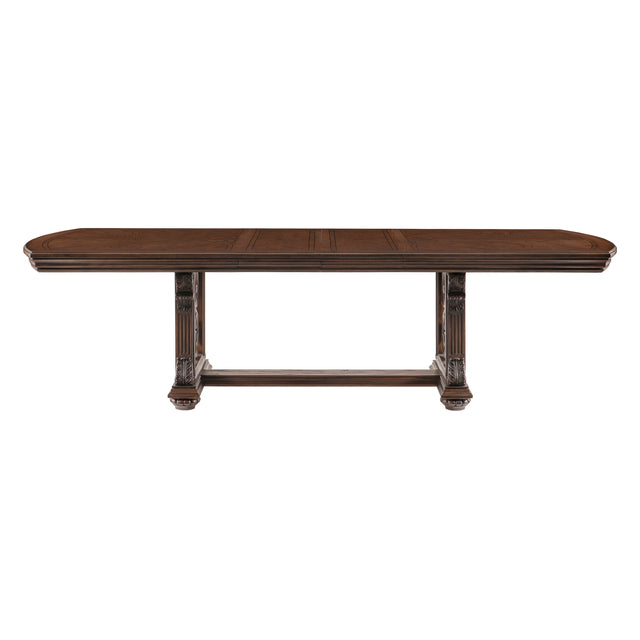 The grand scale of the Bergen Collection invokes a timeless aesthetic for your home’s traditional dining room. The dark oak finish highlights the distinct oak veneer of the collection, while also lending contrast to the decorative pattern of the tabletop’s design. Traditional accenting abounds throughout the collection with classic routed pilasters, moldings, and decorative pediments gracing the table’s trestle base.