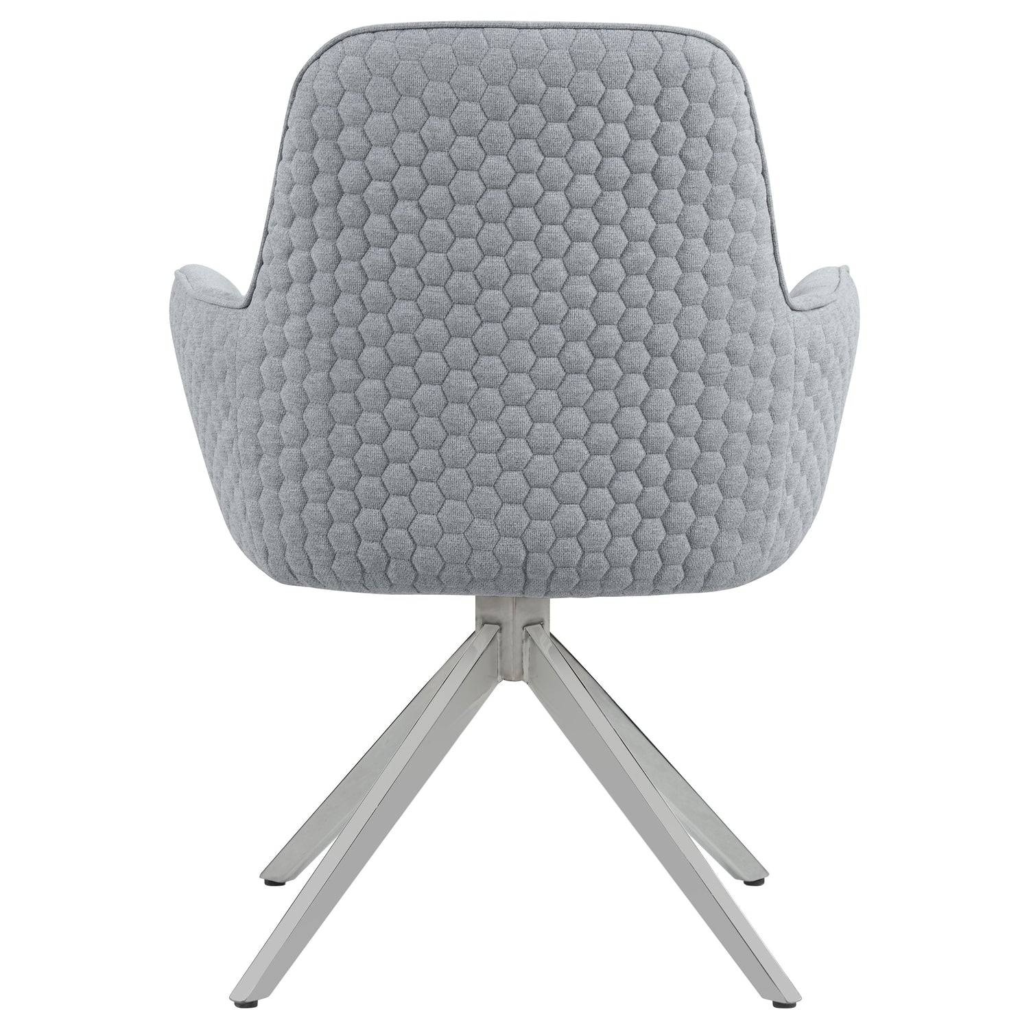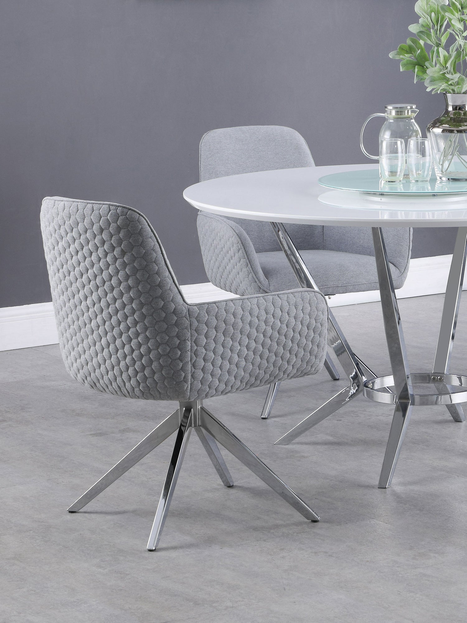 This contemporary dining chair is the perfect addition to casual or formal dining table and room. With a Mid Century modern style bucket seat design, it features elegant low arms and a tall backrest for long-lasting support. Plus, with a 360-degree swivel base in a shiny chrome finish, you can easily get in and out to retrieve drinks or food. Its upholstered seat is wrapped in a light grey fabric with a honeycomb quilted exterior. Available in the same Abby collection is a matching chrome dining table.