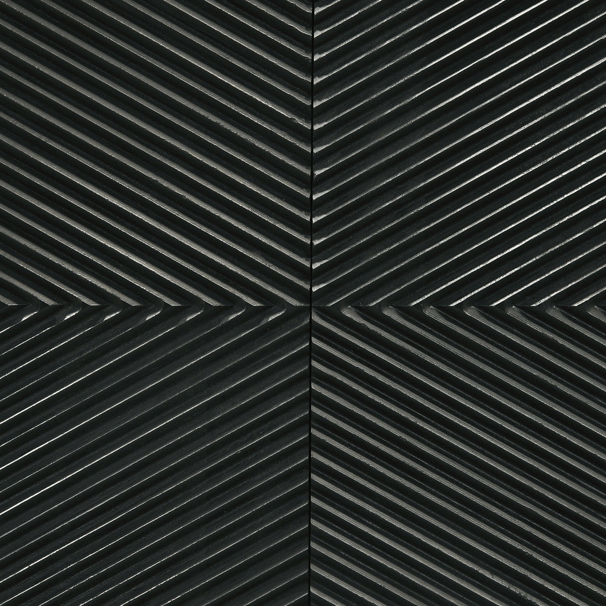 Bold finish composite wood and iron merge to create a stylish and durable four-door accent cabinet. Perfect for use in your dining room, living room, or media room, this chic cabinet is versatile and attractive. Diagonal self-striping adds textured effects on its door fronts to create a compelling look. Find space on two adjustable shelves behind four doors that open with matching black iron vertical pulls. Set atop a geometric black finish iron frame, this cabinet serves as a striking example of bold style.