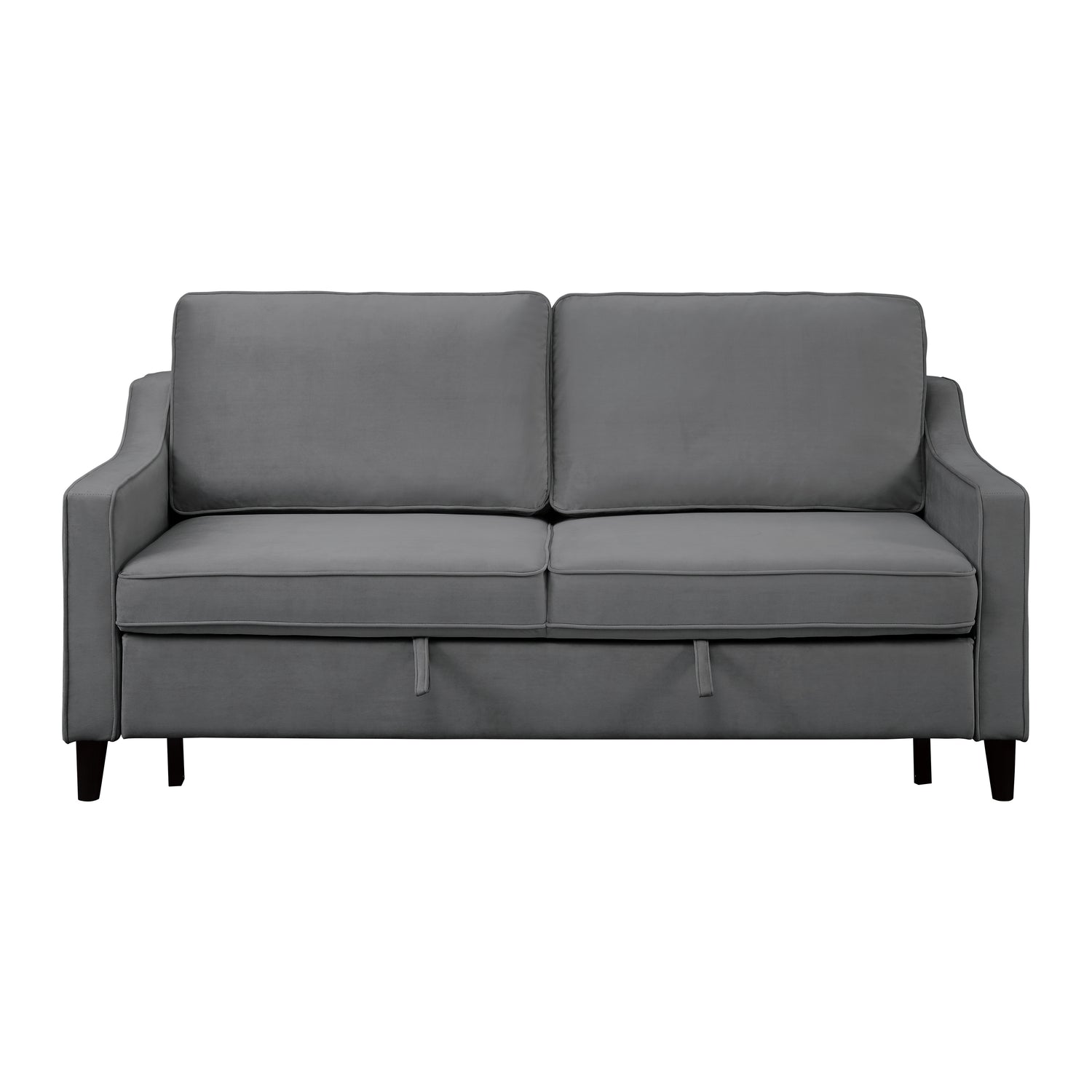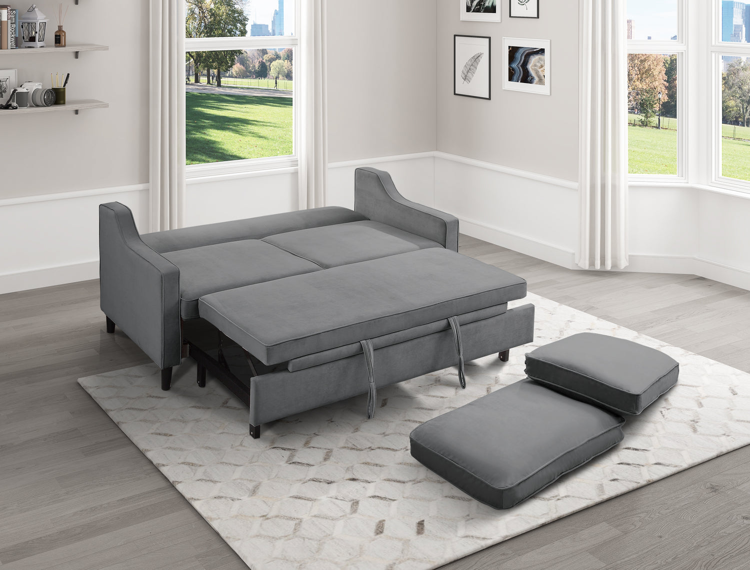 The adelia collection provides a one-of-a-kind seating choice for your home as a result of its adaptability to a variety of functions. this sofa has a pull-out bed and a seat back with a mechanism that clicks into place, so it may be used as a platform for sleeping or relaxing. both sides of the seatback cushions can be removed and used depending on your preference. the traditional profile, along with the dark gray velvet cover that provides a neutral decorative placement and a plush feel, further expands the flexibility to place this piece in a variety of different household contexts.