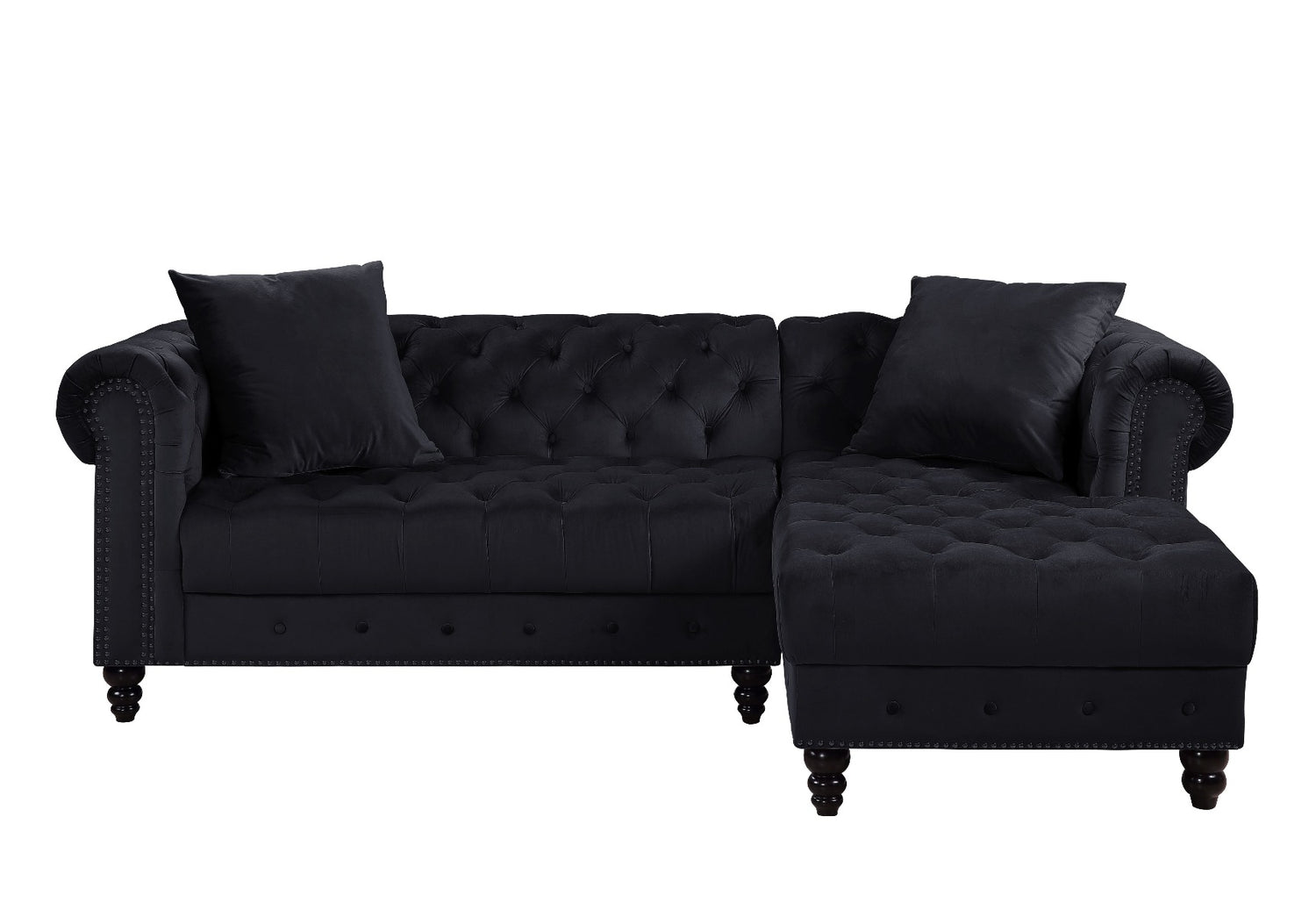 Create a chic living room with the Adnelis sectional sofa. It is beautifully upholstered in lustrous velvet. It is designed with spectacular attention to fine details such as button tufting and nail-head trim accents. The rolled armrests add a regal touch to the piece. Sitting atop of sturdy wooden spindle legs that elevate the timeless style. Featuring pocket coil seats for utmost relaxation. This sofa brings in an undeniably elegant touch to your interior space. Available in three colors red, black, and gray. Two coordinating throw pillows are included.