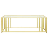 Create a well-styled living room that brims with modern appeal. This contemporary coffee table flaunts a unique design that stands out in any space. The base is beautifully crafted with crisp, clean lines of electroplated metal. A magnificent, matte brass finish adds an edge of elegant allure. The rectangular tabletop is made of clear tempered glass for exceptional quality and style.