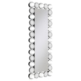 The contemporary full-length mirror lends a wonderful accent piece to your rooms. Featuring 16 LED lights that offer an even glow adding a glamour style to this piece. The Hollywood inspired frame is bordered by individual round mirror tiles, each further framed in sparkling mirror trim. Bold lines and sophisticated mirror plates merge to offer a modern touch. Situate this striking accent mirror within an entryway foyer to greet family and guests, or simply find your beautiful look through this mirror.