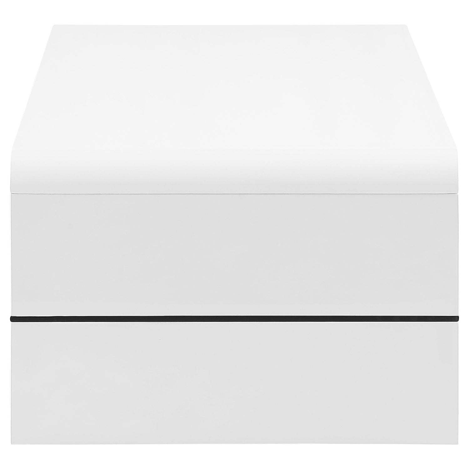A smooth high-gloss finish and white tone lend a clean look to this modern coffee table. Designed with a rectangular tabletop that flows over an elegant waterfall edge into a plank-style base, this coffee table boasts an extraordinarily unique silhouette that gives off contemporary vibes. Sandwiched between is a clear tempered glass shelf that lends a utilitarian touch and open, airy look. Store items and showcase coffee table photography books to give your space an art studio-inspired aesthetic. Sleek surfaces and clean-cut lines push the boundaries of this stunning, modern coffee table.