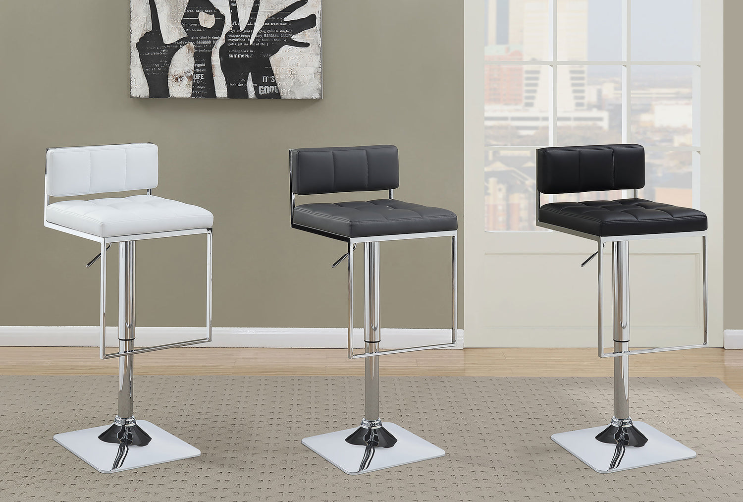 Sleek and compact, this handsome bar stool enhances even the smallest of spaces with an edge of contemporary flair. Its understated elegance easily matches with most any style of decor. The crisp, clean lines of its modern silhouette combine pleasingly with the classic tufting of its plush, leather-like seats. A shiny, silvery chrome finish adds an appealing touch of polish. This versatile stool is easily adjustable to accommodate the height of any table or counter, upgrading any living space with comfort and convenience.