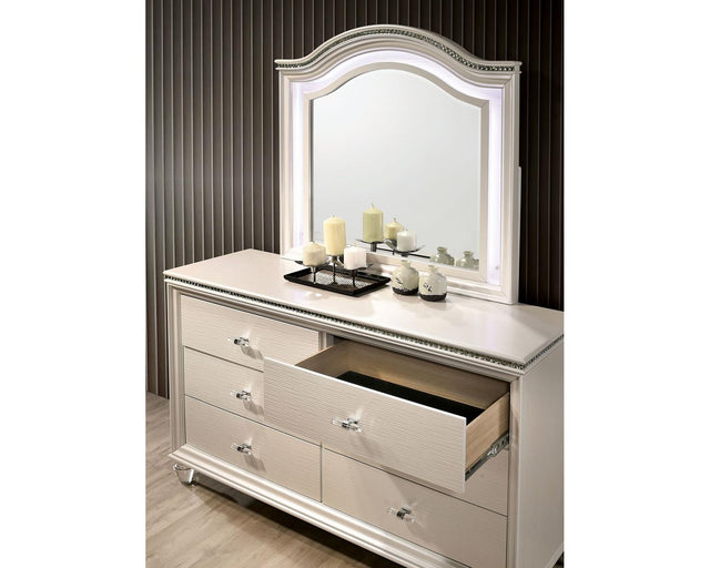 This dresser from the Allie Collection is one the kids can grow with. The pearl white finish, classic design, and metal accents pair well with any color, ensuring that this set will match whatever phase they encounter.
