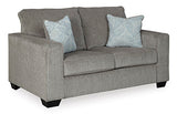 If style is the question, then this striking loveseat is the answer. Sporting clean lines and sleek track arms, the decidedly contemporary profile is enhanced with plump cushioning and a chenille-feel upholstery that's so pleasing to the touch. Sure to play well with so many color schemes, this loveseat in richly neutral alloy includes a pair of understated floral pattern pillows for fashionably fresh appeal.