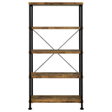 Keep important books handy with this eye-catching bookcase. Styled in an industrial motif, it blends antique nutmeg finish shelving with steel supports finished in black. Find plenty of space to store books and display accent decor. Place in a living room or family room as casual companion furniture. Four shelves and a top surface render this tall bookcase a perfect accent for an office or bedroom.