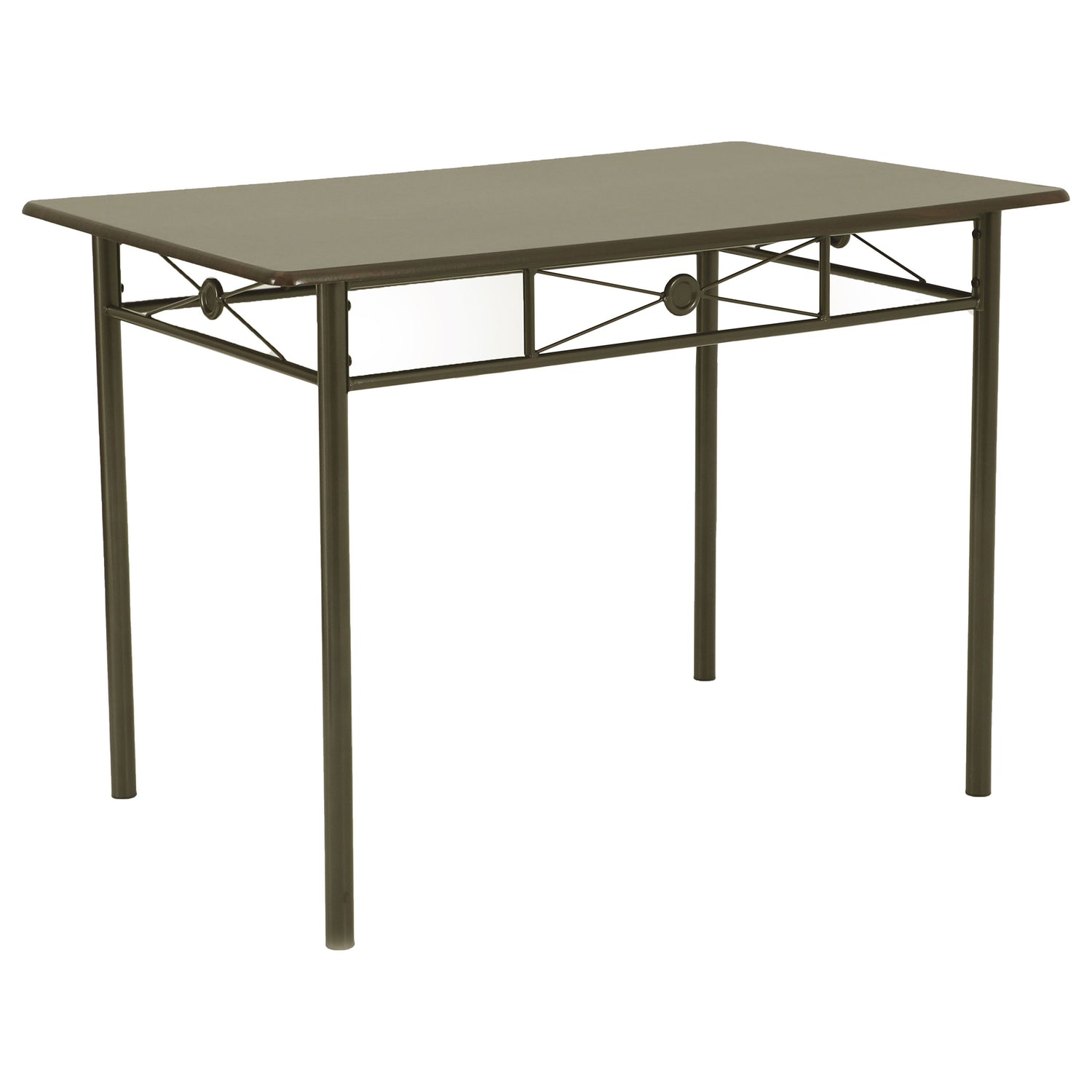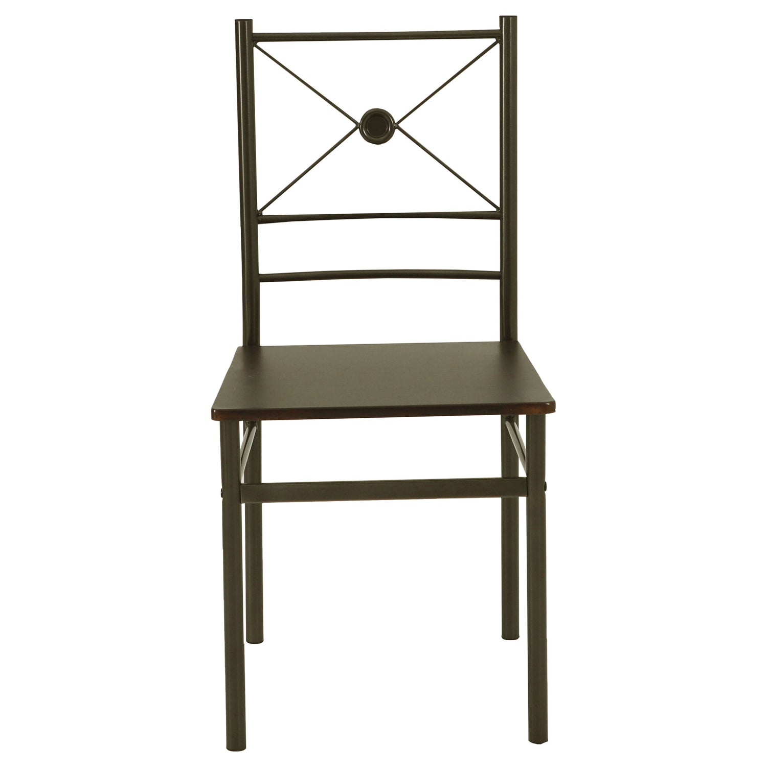 This stunning five-piece dinette set is as fashionable as it is functional. With seating for up to four, it's perfect for an eat-in kitchen or breakfast nook. Its beautiful dark bronze finish is enhanced by an eye-catching crisscross design and artistic circular accents. A vinyl-topped table and seats allow for easy cleaning, while a base of metal tubing provides strength and durability. This lovely dining set is ideal for grabbing a quick bite before heading to work, or for sitting down to enjoy a leisurely meal with the whole family.