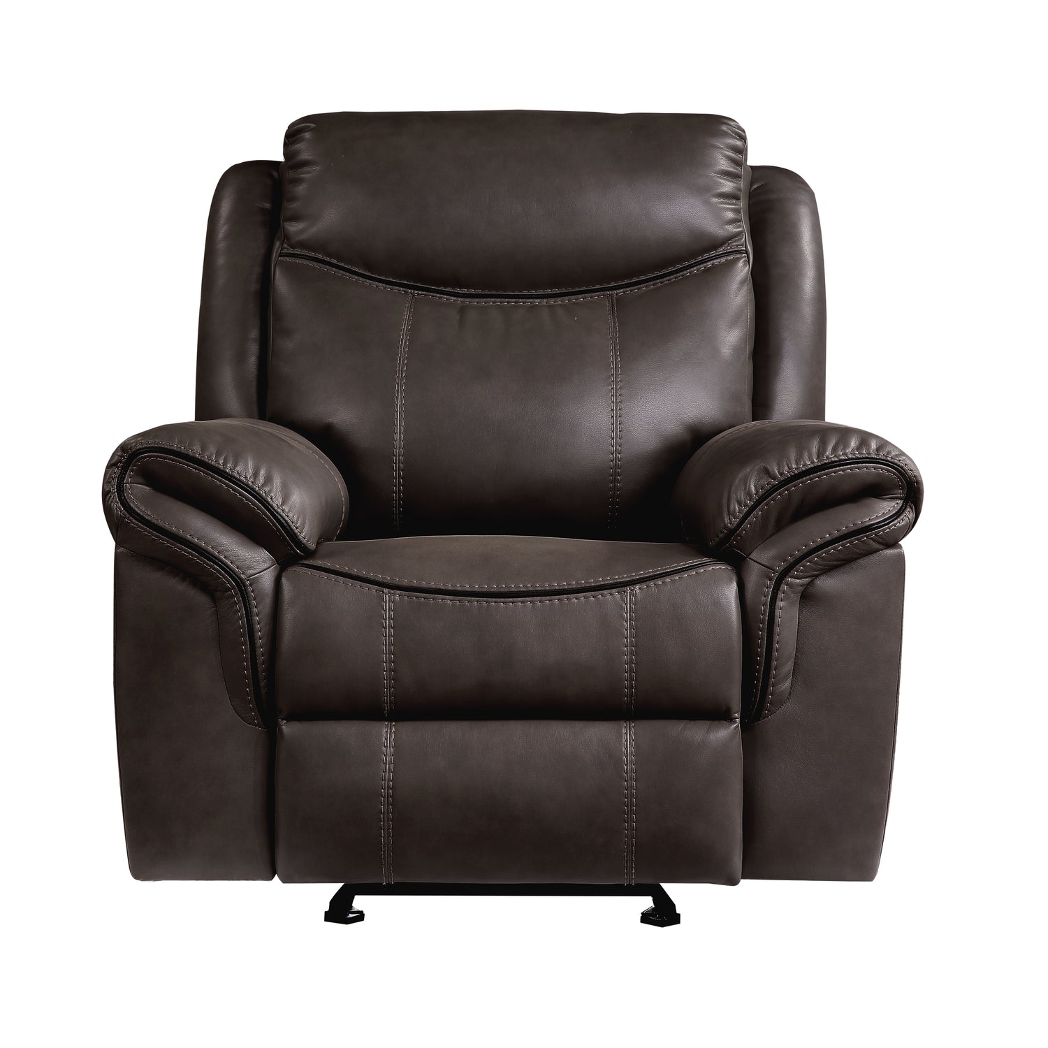 The aram collection will make a wonderful addition to your house because it features products that are generously equipped and produce not only a comfortable but also a functional experience for those who are seated on them. covered in a breathable dark brown imitation leather that looks like real leather for comfort and a stylish look that can easily mix in with your preference for transitional décor. once activated, manual motion mechanisms allow you to move from a seated to a reclined position in a smooth motion. these mechanisms are activated by pulling a tab that is positioned on the side of the chair. the glider function of the reclining chair makes going back and forth in either direction very simple and straightforward to do.
