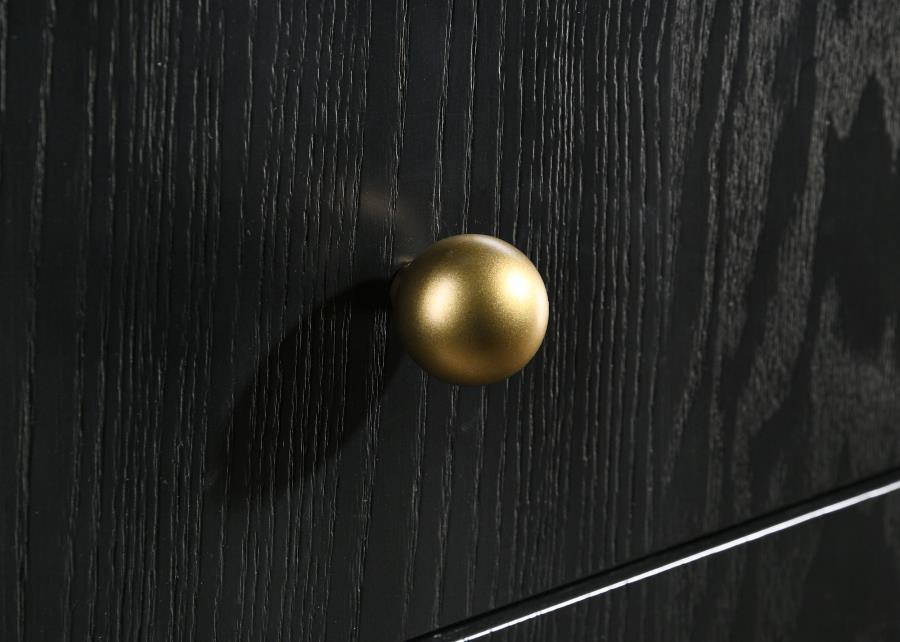 Enhance storage and style in your bedroom with a modern five-drawer chest. Impeccably designed, it features a classic silhouette complete with rounded corners that create a softened effect perfect for a soothing space. The chest offers five drawers for easy and accessible storage, and each is decorated with a pair of petite round knobs in a golden finish. A crisp black finish is wire brushed to create texture, enhancing the wood grain look of this chest. Gold finish legs match the hardware for a cohesive look and the top is perfect for decor.