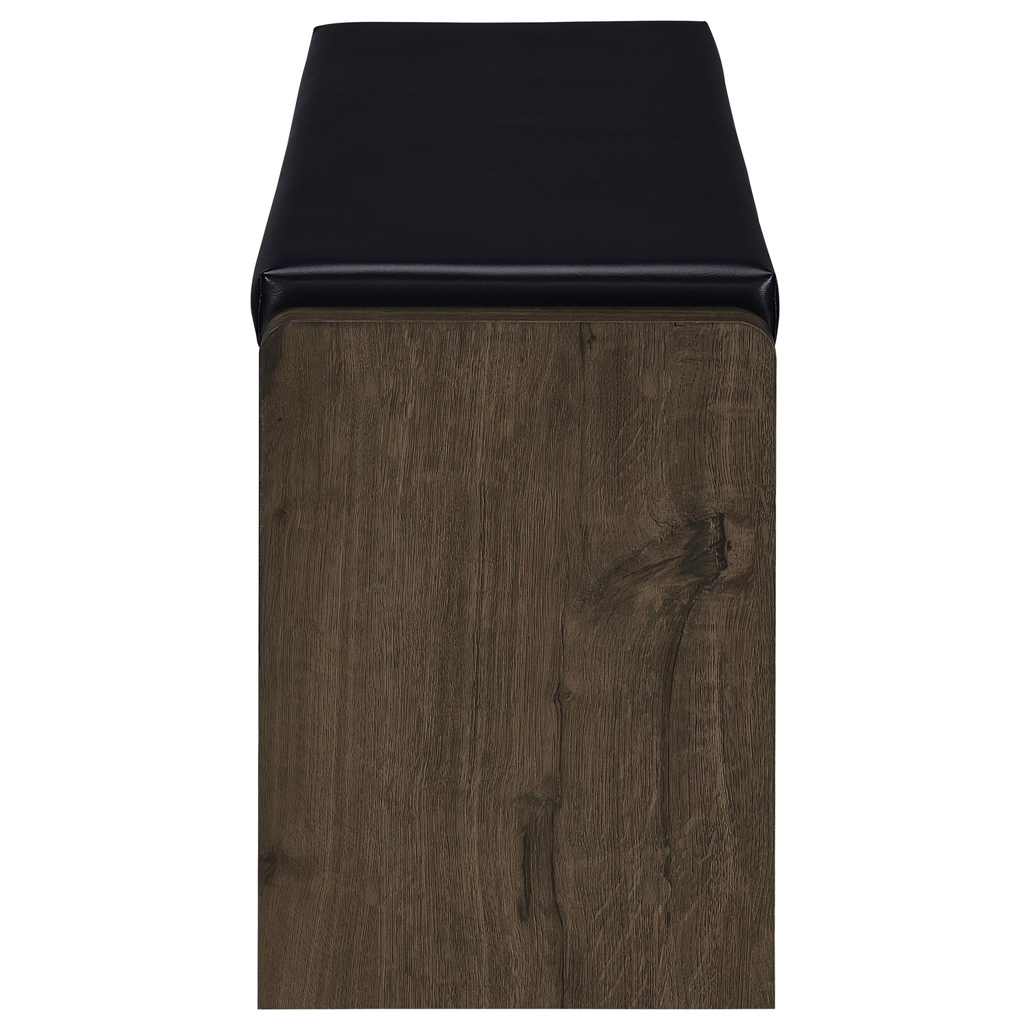 Make your entryway or garage both functional and stylish with this versatile storage bench, designed to keep your space organized. Featuring a foam cushion upholstered in sleek black faux leather, this bench offers a comfortable seat while you put on or take off your shoes. The engineered wood frame, finished with an eco-friendly laminate, offers durability with a modern appeal. The storage includes a pull-out drawer, an adjustable shelf, and an open compartment, perfect for organizing shoes, bags, or other essentials. This bench ensures all your entryway necessities are easily accessible.