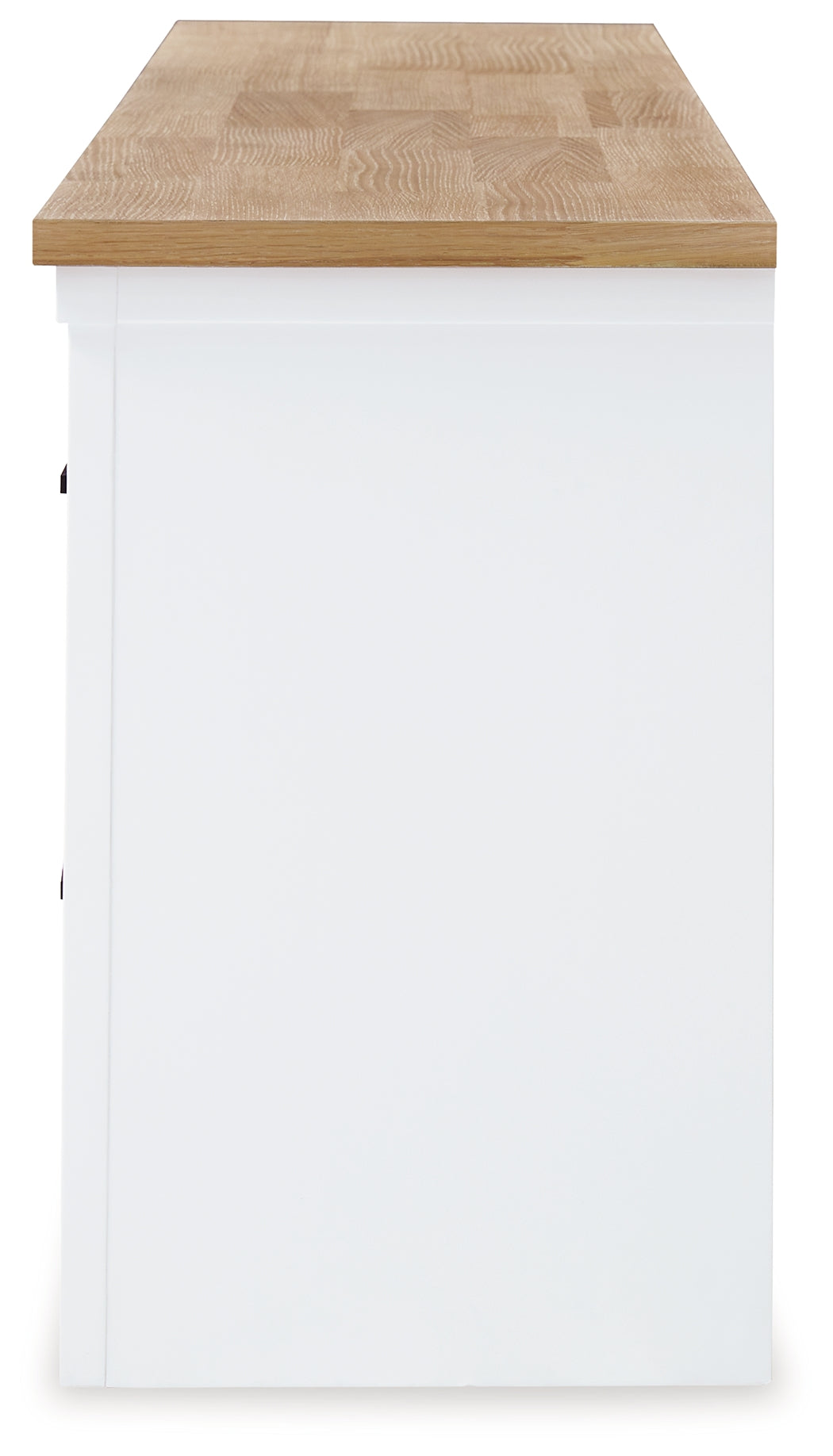 Casual style with substance. This two-tone TV stand raises the bar on comfortably cozy design. A sturdy silhouette with a butcher block oak veneer top, classic white finish and contemporary black metal hardware exudes modern farmhouse vibes. The spacious cabinet, display shelves and drawers let you tuck away entertainment essentials while displaying treasures in this charmingly curated piece. Cutouts for wire management help keep the look relaxed and uncluttered.