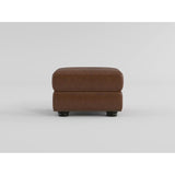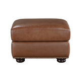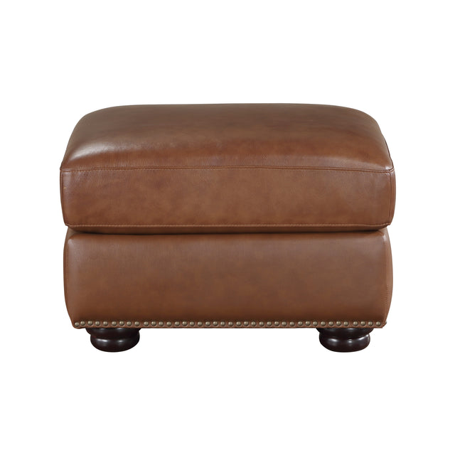 The addition of the attleboro collection to your home is the perfect example of a wonderful match to your home's traditional style. the portions of the ottoman that are touched by the hand are covered in camel brown top-grain leather, and the areas that are not touched by the hand are covered with imitation leather-match. the ottoman can be used both as seating and as a footrest. the nailhead trim was used as an accent around the base rail of the ottoman.