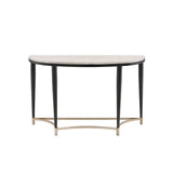 KD, Half-Moon Sofa Table NO Storage Wooden Top, Metal Tapered Leg CONSTRUCTION] Wooden Top: Veneer (Paper)+ PB Metal Apron Trim Metal Sled Base: Black Finish, Metal Tube (Arched 4-Crossbars Supports: Gold Finish)