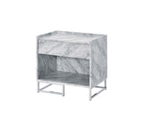 With bold, extravagant textures, the Azrael Accent Table beautifully complements a modern home. White printed faux marble highlights the clean, straight lines of the accent table, showcasing a luxurious appeal and simplistic elegance. Metal sled base with shiny chrome finish enhances it's intriguing look and feel. It offers a drawer and open compartment that provide necessary bedroom storage.