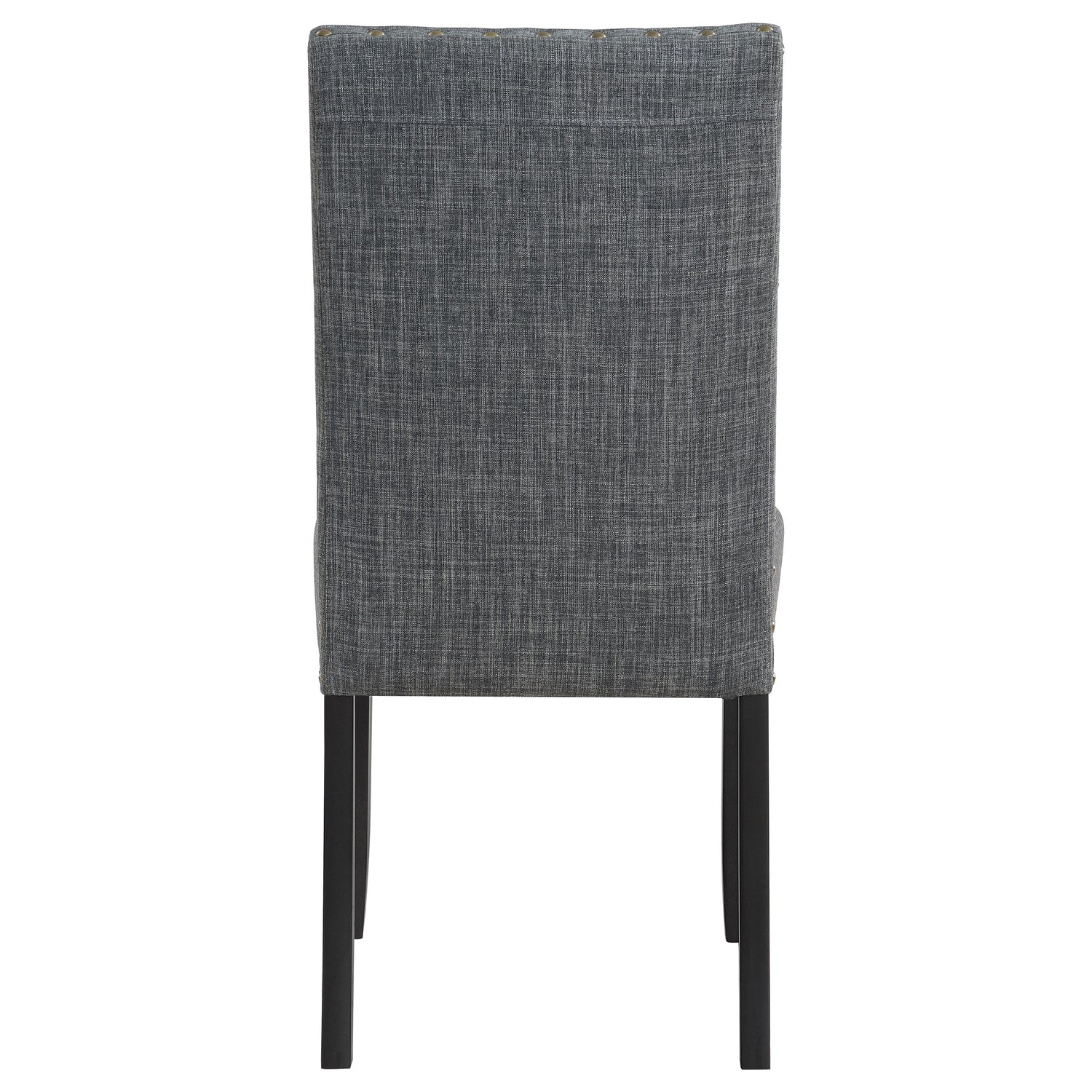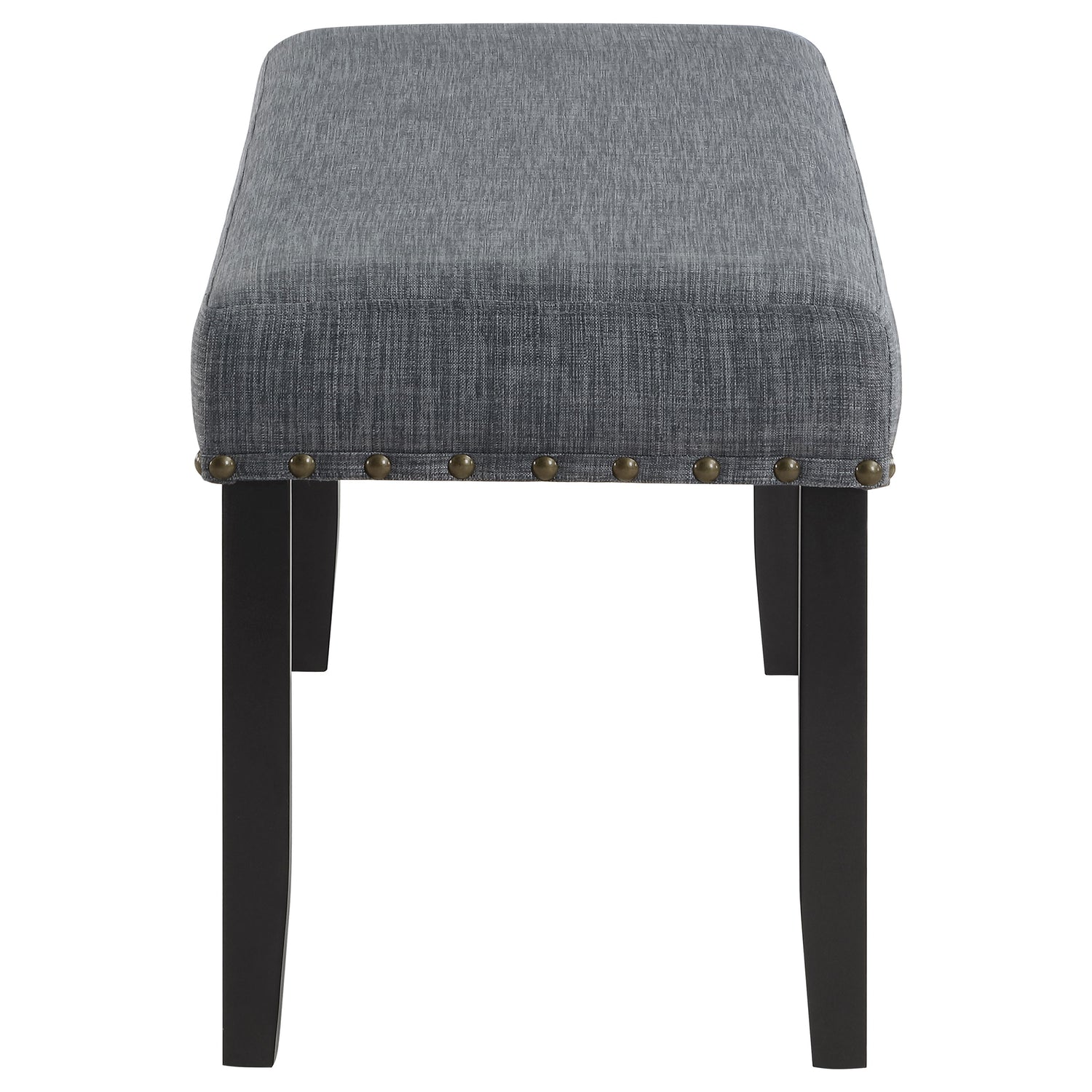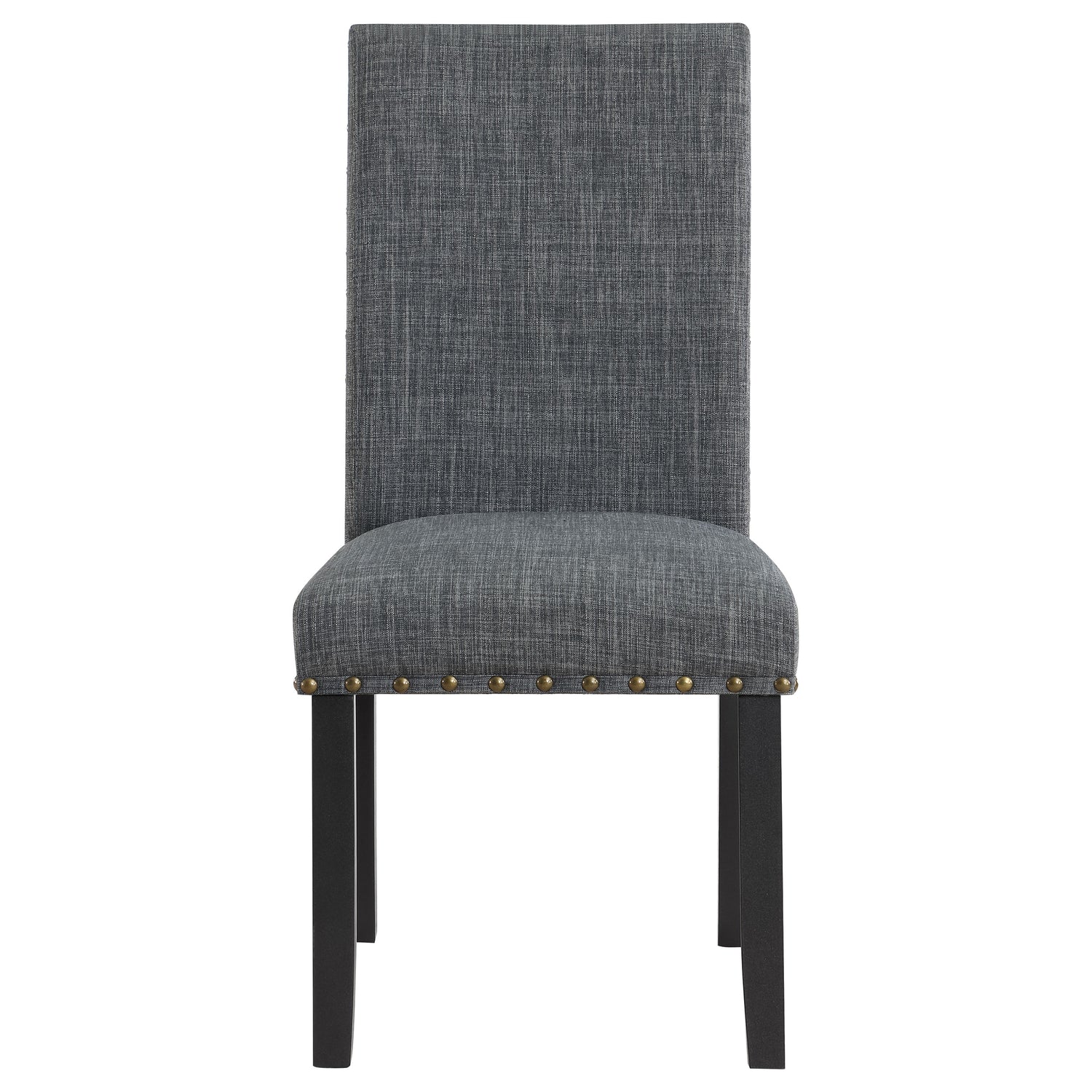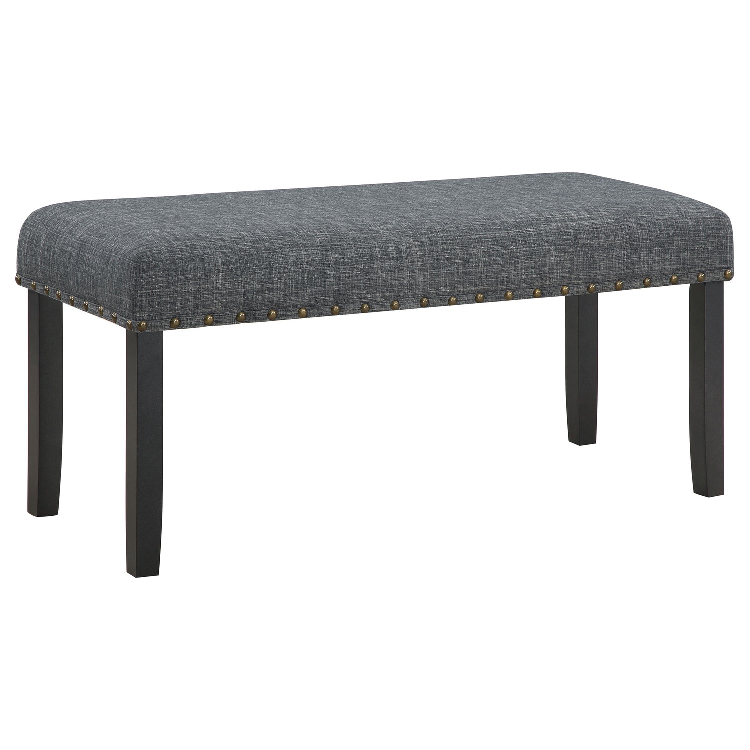 Assemble a look of understated elegance with this 6-piece dining set, a blend of modern design and classic comfort. The rectangular dining table boasts a durable grey wood-look decorative laminate top, a surface resilient to life's moments, set upon a solid black wood base for a stark, stylish contrast. Accompanying the table are four parson chairs and a matching bench, each piece wrapped in a grey fabric that whispers sophistication. Hand-driven bronze nailheads detail the upholstery, adding a bespoke touch to each meal. This dining set is a statement of style and function, ready to host everything from quick breakfasts to long dinners with friends.