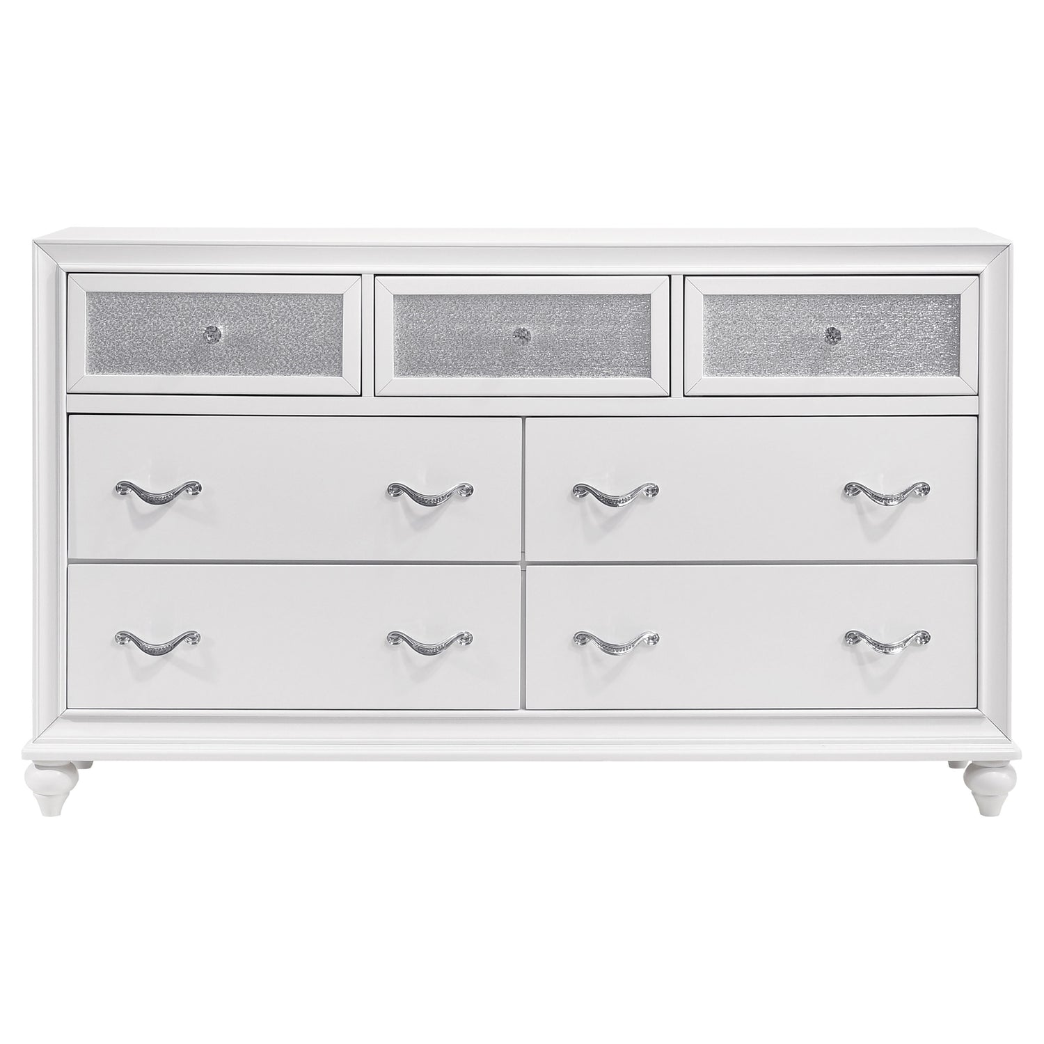 Stylish and ultra-glam, this modern dresser really stands out. The top drawer fronts are covered in sparkling acrylic panels for a stunning infusion of shine. Faceted crystal hardware takes elegance to the next level. Dainty turned feet add a classic element to its glamorous design. Available in finishes of black or white, there's an option to add some sparkle to any space.