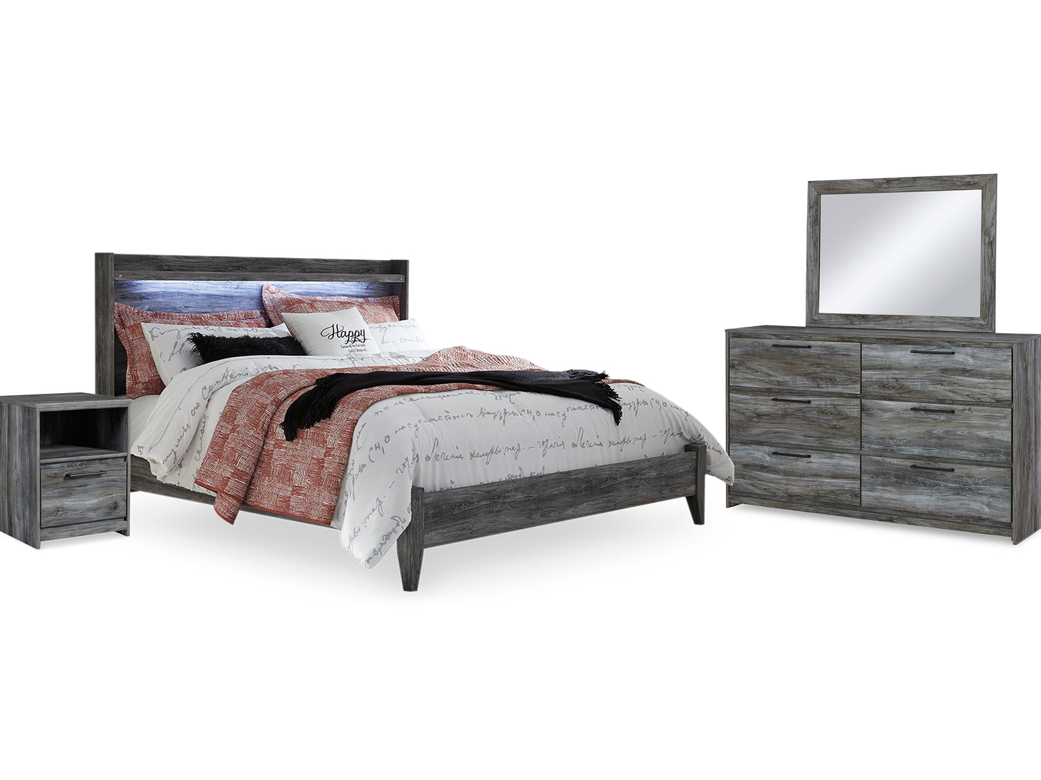 Baystorm Gray King Panel Bed, Dresser, Mirror, And Nightstand