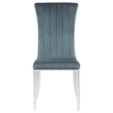 Create a sophisticated setting for formal dining with this gorgeous velvet side chair.This posh piece from Coaster is beautifully crafted with soft, sumptuous, grey velvet upholstery.Vertical tufting gives it an extra touch of visual appeal.The comfortably padded seat sits atop a sleek, stainless steel base in a high-shine chrome finish.A subtle, rolled back rounds out its design in style.