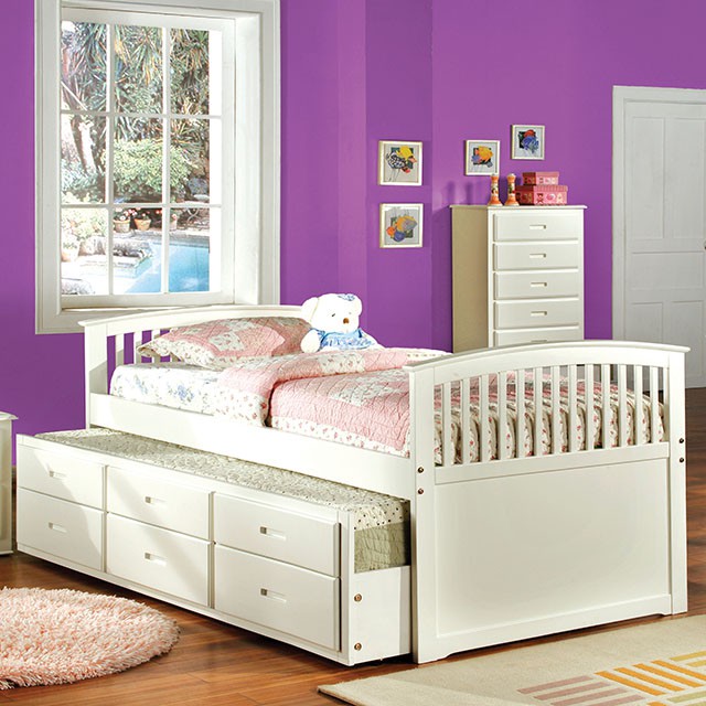 This contemporary style trundle bed features a picket fence style headboard and footboard with extra storage with three drawers underneath the trundle. The matching dresser, mirror, chest and night stand are finished in bright white and have unique recessed handles.