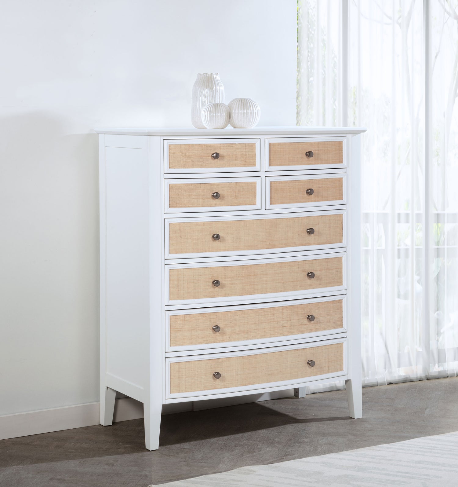 Create ample storage in your stylish bedroom with a modern eight-drawer chest. Its coastal style is established with a cool white finish paired with natural rattan finish accents on its drawer fronts, offering compelling contrast and texture. Eight drawers include four small and four large, with black felt lining in the top drawers to add a touch of luxury and protection. The case features a gently bowed front that adds inviting energy to its silhouette. A roomy top is ideal for decor and personal effects, perfect for framed photos and a jewelry box.