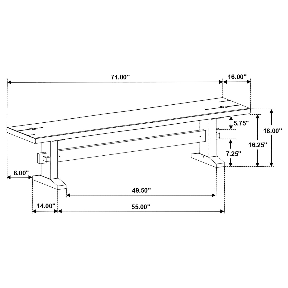 Save space and add style at the same time. This dining bench is perfect for a rustic or relaxed dining table. Sporting a backless, armless silhouette, the bench tucks away underneath the table, conserving precious space when needed. Its wood seat shows off a wonderful natural honey finish with soft warmth to complement any space. A trestle-inspired base adds character and features a smokey black finish that offers just a hint of depth and contrast.