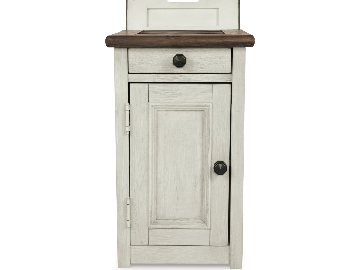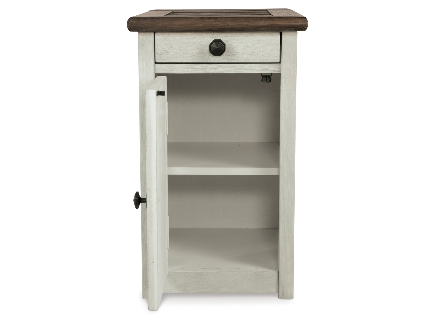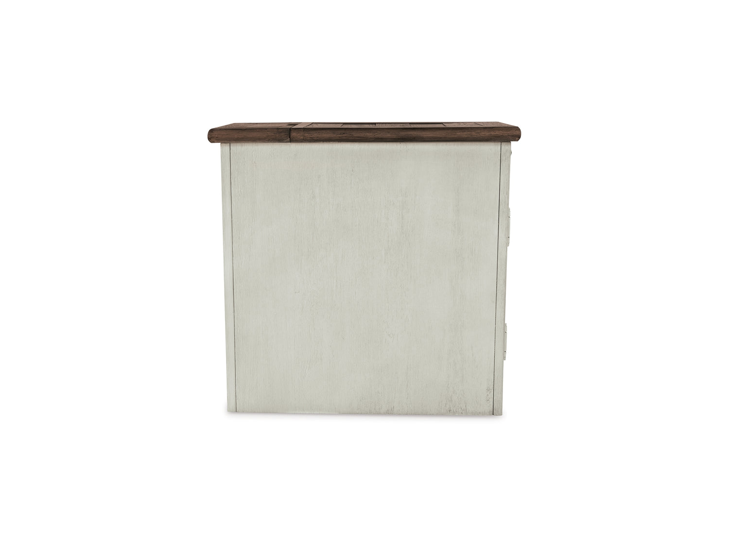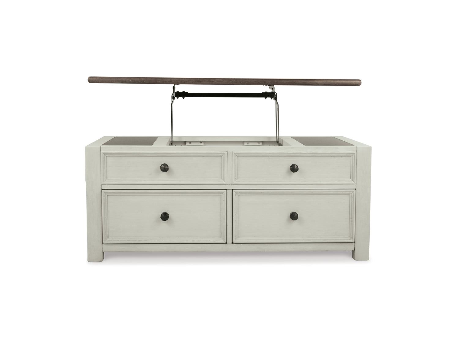 Series Features: Made with select hardwood solids and white oak veneers in a weathered gray finish. Paint grade materials form the base and finished in an antique white color. Tables feature plank and frame top and casual styling throughout. Cocktail features 4 working drawers and lift top. Casters for mobility. T637-7 chair side table has pullout tray, large door for storage and lift up top (back section) that exposes an AC power supply with 2 USB charging ports. Also included in the collection are a sofa table and end table with generous proportions. T637-107 has a plank-styled top. Smooth gliding drawer. Integrated 110V power supply with dual USB charging ports. Black faceted hardware.