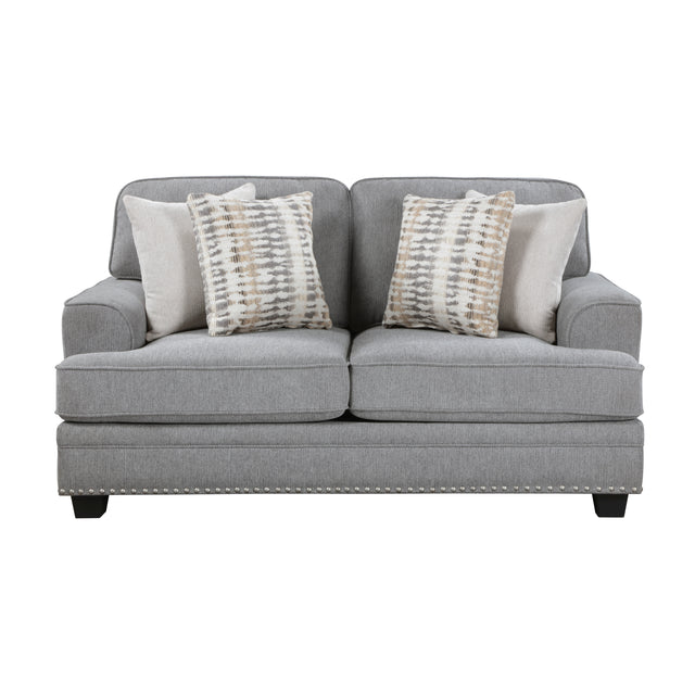 With a transitional design that is a complement to your home’s living room, the Bradford Collection utilizes classic lines, refined texture, and traditional accenting to achieve a universally appealing look. The love seat is covered in gray chenille fabric upholstery. Nail head trim accents the base rails, while profile-defining welting provides a tailored finish. Complementing contrast toss pillows are paired with the love seat.