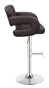 This recreation bar stool is at home at a kitchen island or in the rec room. Chrome stand and base combine with brown upholstery for a unique complement to your decor. Padded armrest makes it easy to relax like in a traditional chair. Raise the seat to get a view of the room or lower it to get lost in your thoughts. A button-tufted diamond pattern design on the backrest gives bar seating a fresh interpretation.