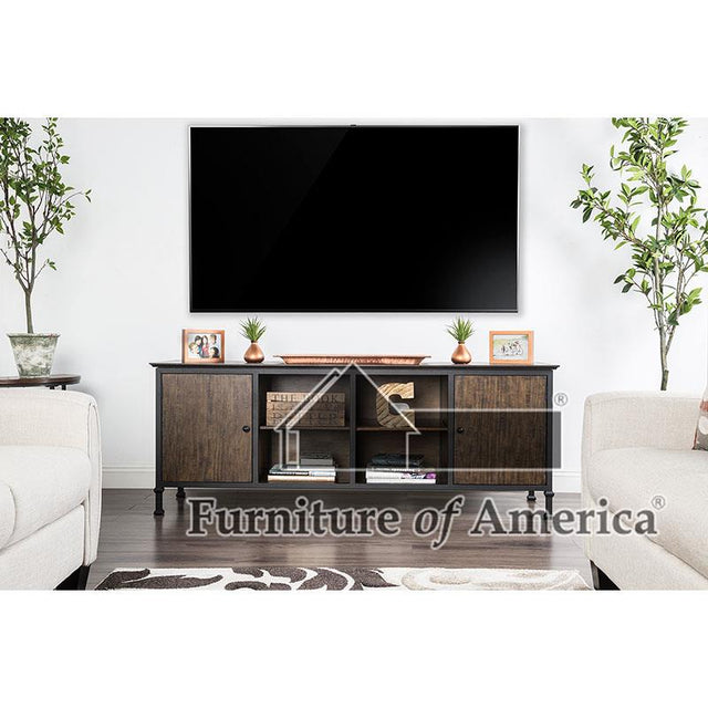 Add a bit of retro flair to your living room with this sturdy industrial style TV stand! Built for maximum storage capabilities, this TV stand's various shelves and cabinets provide just enough space for all of your entertainment needs. Display your media devices and other items on the open shelves or inside the cabinets to keep your home organized in a chic and refined way!