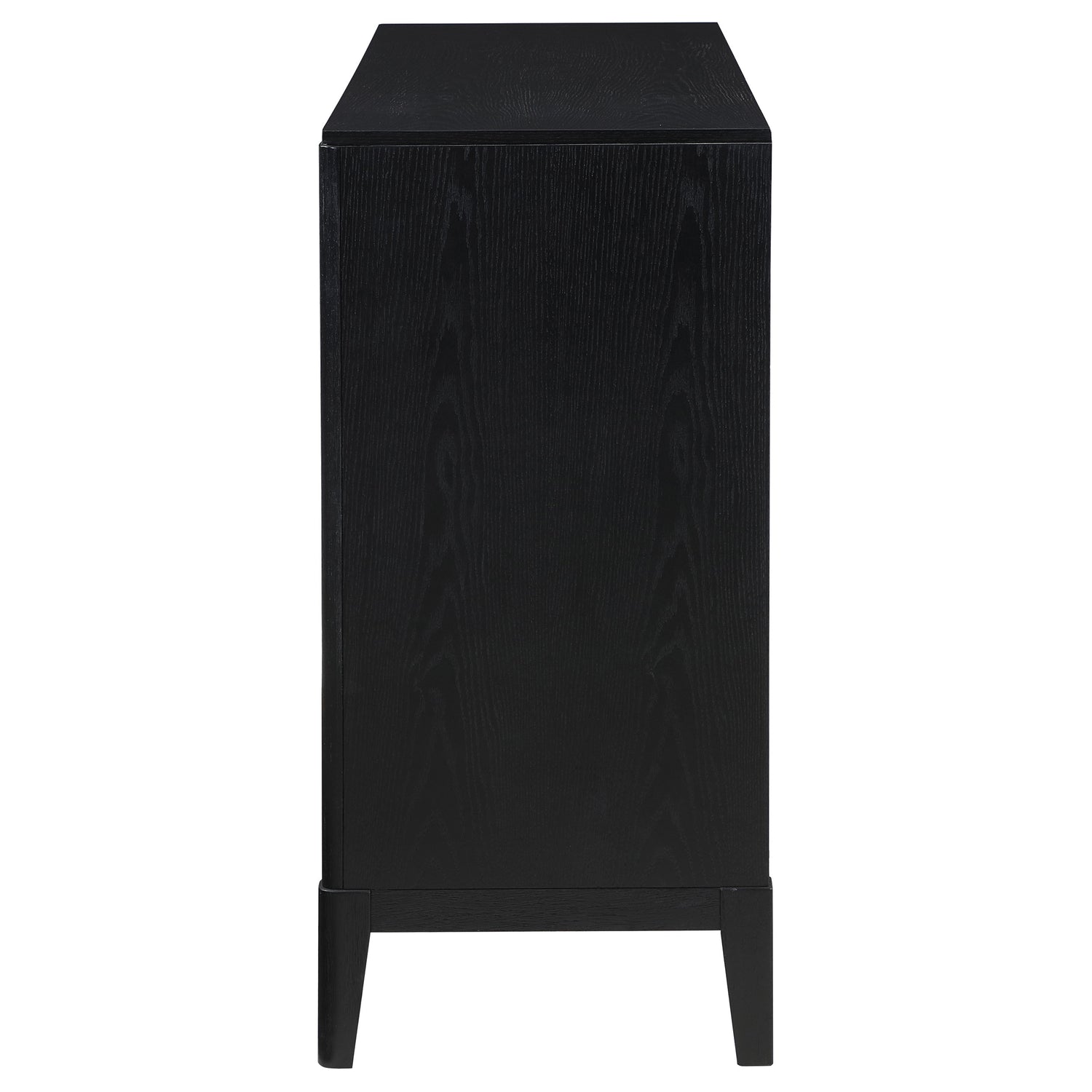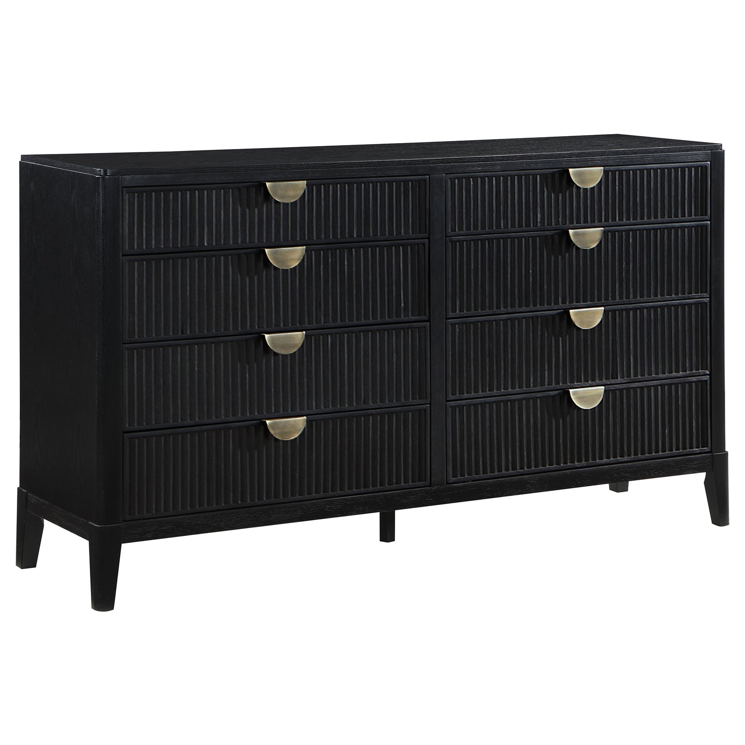 Create a single place to organize clothing and accessories with a stylish, modern eight-drawer dresser. Its timeless stance is augmented with a black finish complete with wire brushing that creates subtle texture and dimensionality. Drawer fronts offer fluted texturing, creating a sense of depth and movement. Half-moon drawer pulls complete the look with a soft golden metallic finish that gleams in the light and adds impeccable warmth. Top drawers include felt lining to protect your delicates, while lower drawers are larger, perfect for everything from sweaters to linens.
