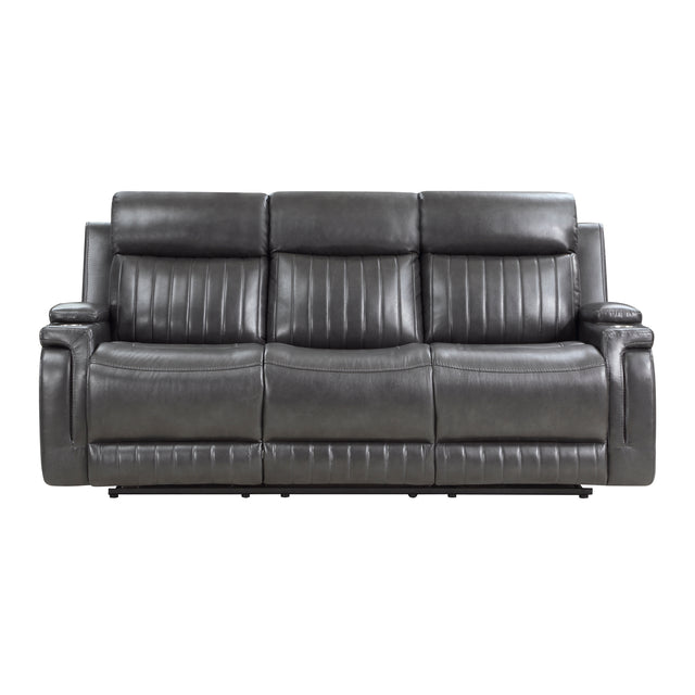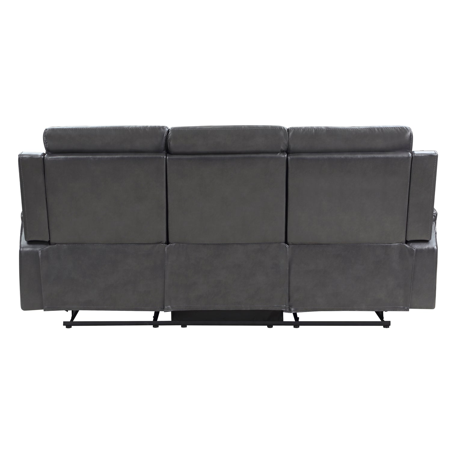 Modern lines and plush comfort comprise the design of the Broomfield Collection. Contour accent stitching fronts the seating of the collection providing contemporary detail, while the gray breathable faux leather lends to your overall comfort. Creature comforts come in the form of the dual recliner sofa’s drop-down center back, with its cupholders and tabletop. The sofa features arm-mounted cupholders and manually engaged tab-pull reclining mechanisms.