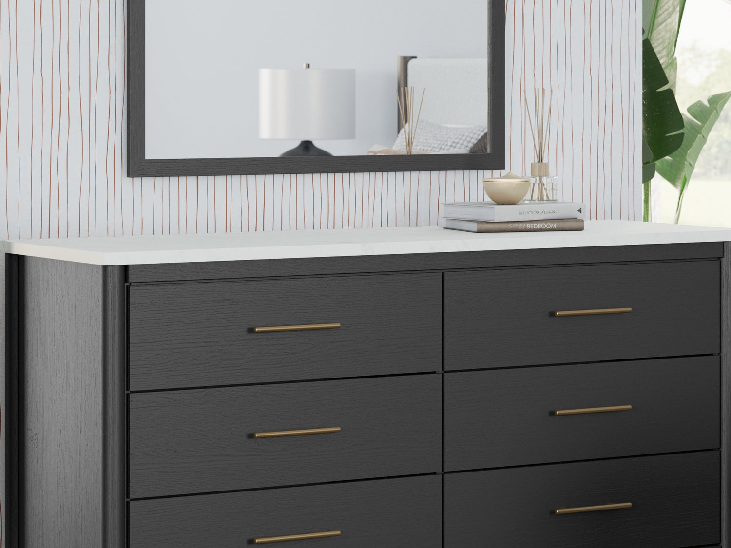 Series Features: Matte black finish with subtle replicated wood grain accented with a replicated white marble top. Beds and cases feature round post leg details. Cases accented with light bronze colored finished handles. Side roller glides for smooth operating drawers. Drawer interiors are lined with a replicated linen design for a clean, finished look. Both USB and wireless charging options are provided with the nightstands. Nightstand (91) features ambient lighting under the top. Upholstered headboard options (57,58,87) feature a white textural fabric and wooden vertical posts. Headboards (57,58,87) attached to footboards (54,56,84) respectively. Footboards (54,56,84) require the use of B100-12, B100-13 or the B100-14 roll slats. Black upholstered bed full (72), queen (81), king (82) do not require additional foundation/box spring; accommodates most zero clearance adjustable bases. Safety is a top priority, clothing storage units are designed to meet the most current standard for stability, ASTM F 2057 (ASTM International). Drawers extend out to accommodate maximum access to drawer interior while maintaining safety. Minor assembly required.