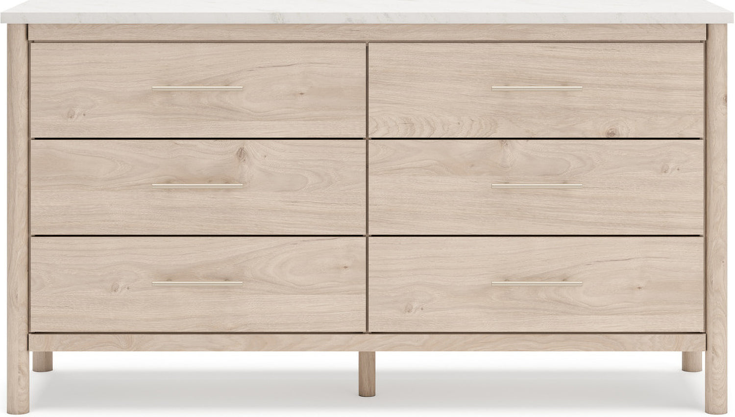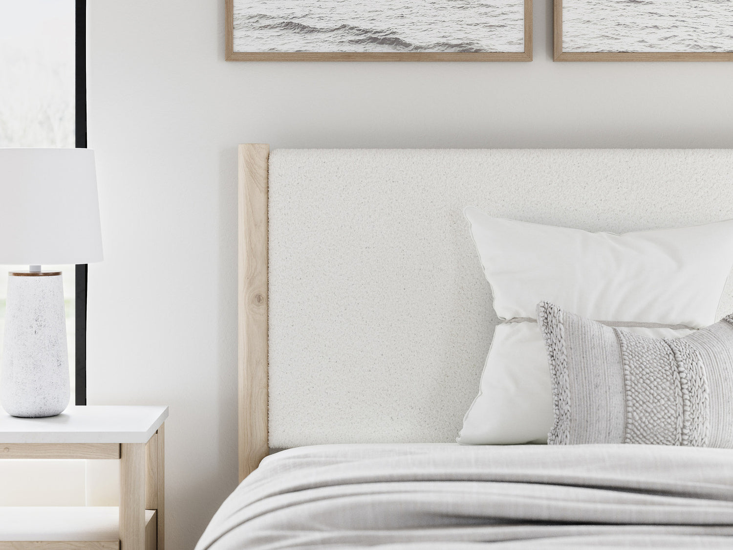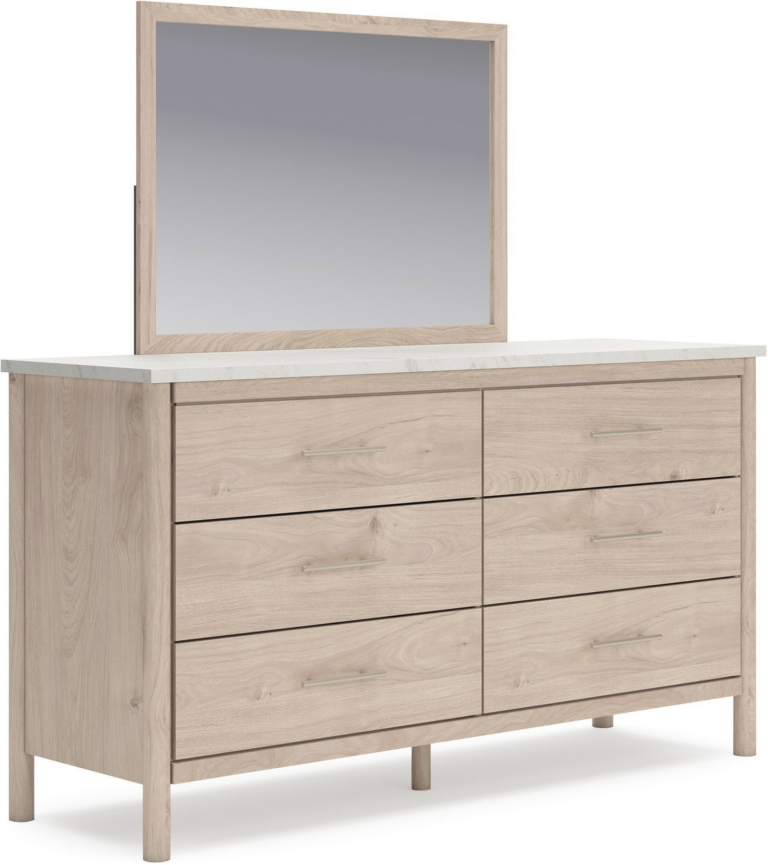 • Includes upholstered panel headboard, panel footboard with rails and roll slats, nightstand, dresser, mirror|Made with engineered wood (MDF/particleboard/plywood) for the right balance of affordability and durability|Smooth, light finish with replicated oak grain|Replicated marble top|Textured polyester upholstery|Handle with champagne colored finish|Round post legs|Storage cubby|Bed does not require a foundation/box spring|smooth-gliding drawers|Drawer interior is lined with a faux linen laminate for a clean, finished look|Mattress available, sold separately|Built-in ambient lighting under top|Safety is a top priority, clothing storage units are designed to meet the most|USB-C and wireless charging options|Assembly required