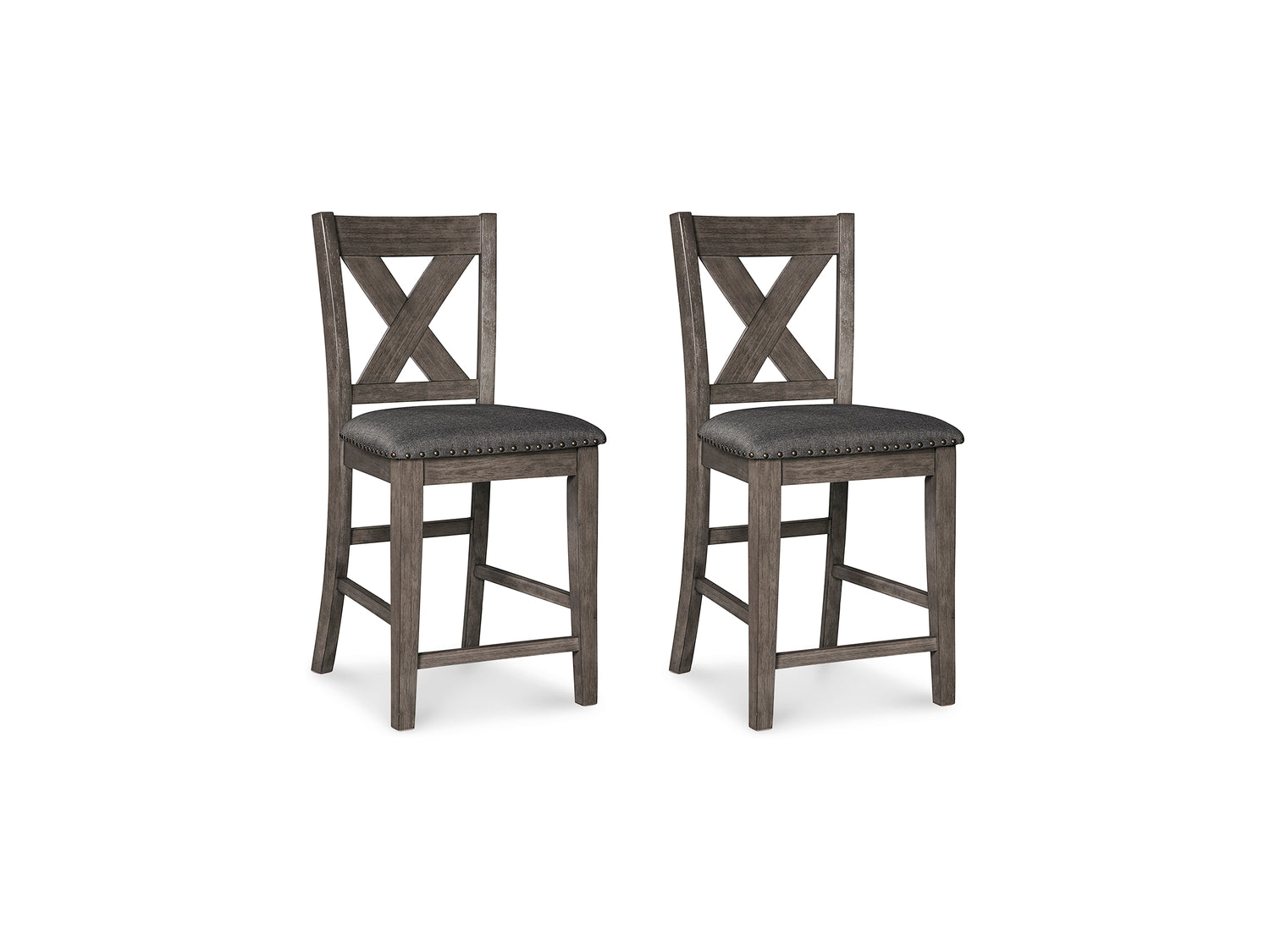 Series Features: Casual lifestyle design constructed with Acacia veneer and solids. Finished in an antiqued gray wash color. X-back chairs feature solid wood frame and cushioned seat covered with a gray textured polyester fabric with nail head trim. Matching backless bench features nail head trim. D388-113 has storage shelves on one end with a sturdy stretcher. Backless stools with upholstered saddle seat design. D388-425 rectangular dining table and six X-back chairs. Chairs feature solid wood frame and cushioned seat covered with a gray textured polyester fabric with nail head trim. D388-425 chair dimensions: 19"W x 22"W x 38"H. D388-224/230 has solid hardwood frames with metal back supports and footrest. Swivel seats feature a gray textured polyester fabric with nail head trim. Finished in an antiqued gray wash color. D388-423 table made with hardwood solids, Acacia veneer and MDF substrate. Stools are made with hardwood solid frames and foam cushioned seats with a polyester fabric. Antiqued gray wash finish. D388-423 includes 6 upholstered stools and counter height table.