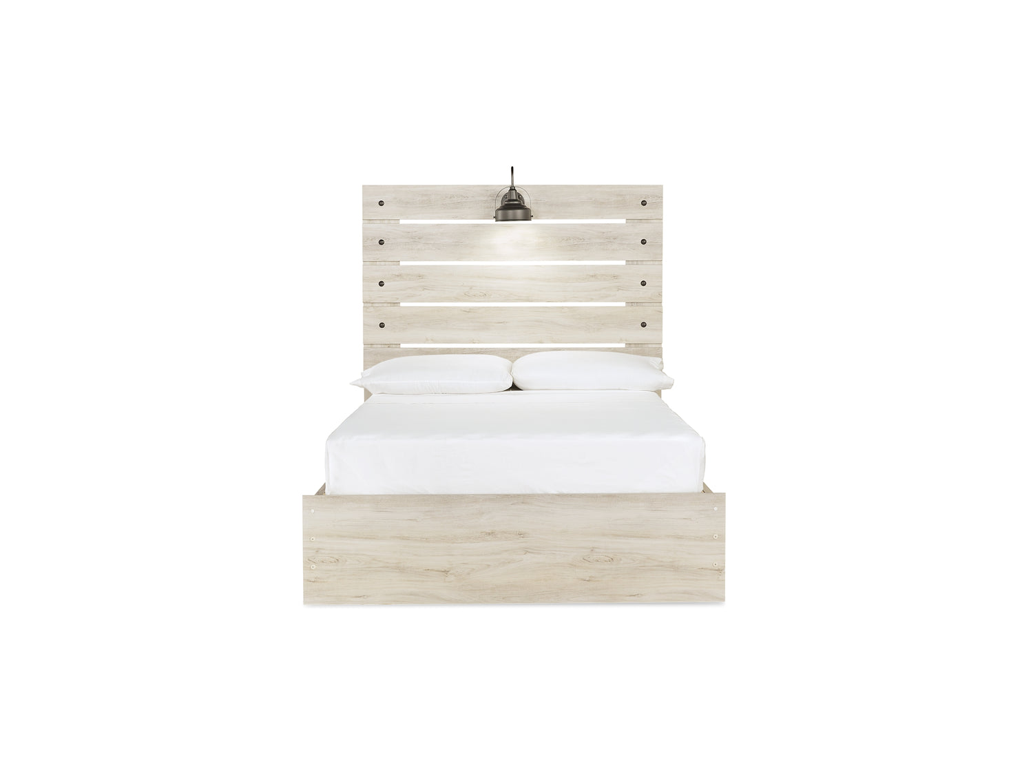 Series Features: Wispy white finish over replicated Oak grain with authentic touch. Large scaled dark colored handles. Cases feature a framed front and pilasters. All panel headboards (53,57,58,87) feature decorative matte black sconce lights. Side roller glides for smooth operating drawers. All panel headboards (53,57,58,87) can attach to a bolt-on metal bed frame B100-31 or B100-66 respectively. Drawers lined with a faux linen laminate for a clean, finished look. Slim profile dual USB chargers located on the back of the night stand top and the side of the headboards. All side storage options (50,150,60,160) requires the use of the B100-11, B100-12, B100-13 or the B100-14 roll slats. All under bed storage units (50,150,60,160) accommodates to 11"W x 11"D x 11"H cube storage bins. All beds have a panel footboard (84,54,56) and storage footboard option (84S,54S, 56S). Panel headboards (53,57,58,87) can attach to a bolt-on metal bed frame B100-31 or B100-66 respectively. Safety is a top priority, clothing storage units are designed to meet the most current standard for stability, ASTM F 2057 (ASTM International). Drawers extend out to accommodate maximum access to drawer interior while maintaining safety.