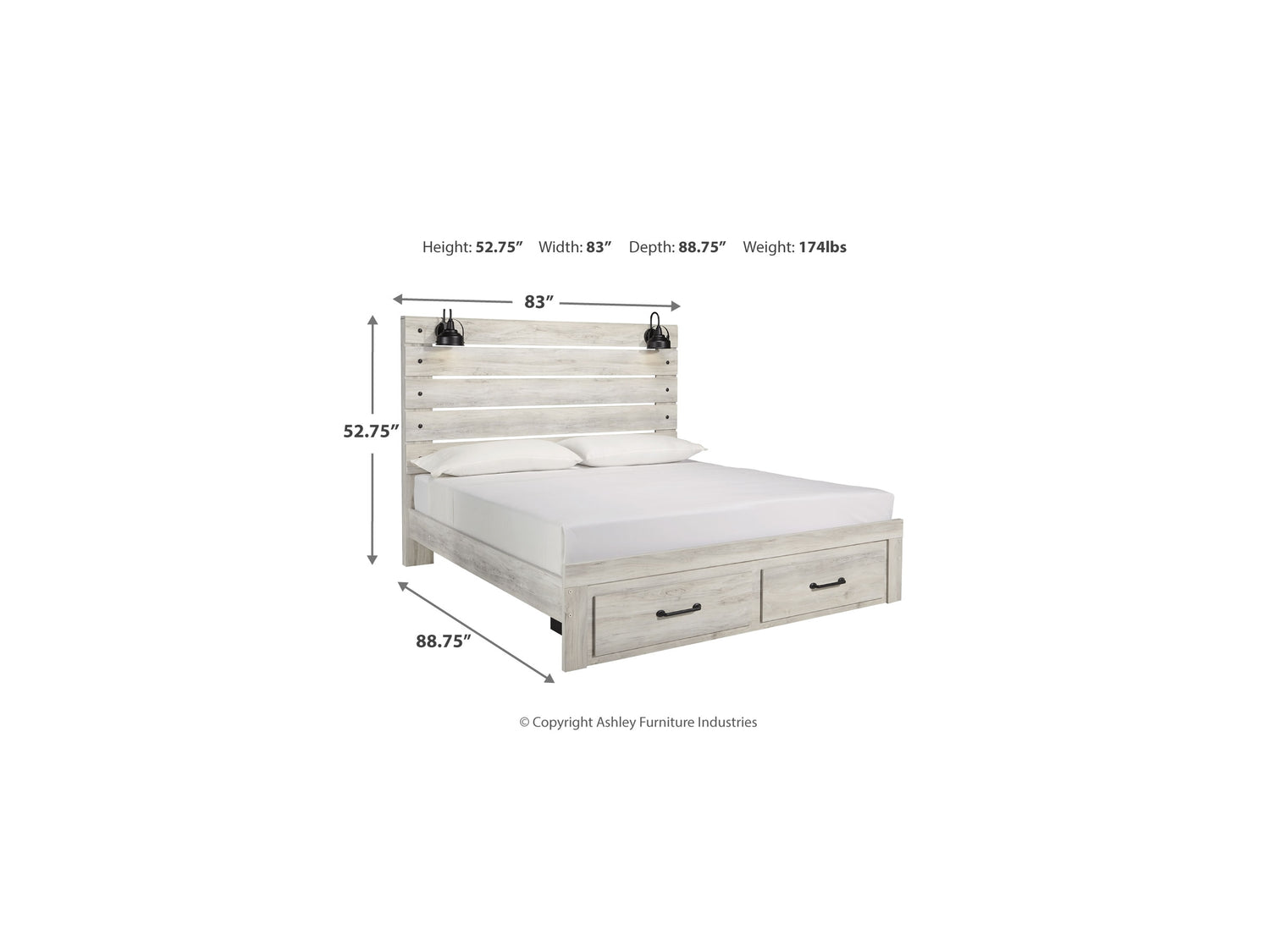 Series Features: Wispy white finish over replicated Oak grain with authentic touch. Large scaled dark colored handles. Cases feature a framed front and pilasters. All panel headboards (53,57,58,87) feature decorative matte black sconce lights. Side roller glides for smooth operating drawers. All panel headboards (53,57,58,87) can attach to a bolt-on metal bed frame B100-31 or B100-66 respectively. Drawers lined with a faux linen laminate for a clean, finished look. Slim profile dual USB chargers located on the back of the night stand top and the side of the headboards. All side storage options (50,150,60,160) requires the use of the B100-11, B100-12, B100-13 or the B100-14 roll slats. All under bed storage units (50,150,60,160) accommodates to 11"W x 11"D x 11"H cube storage bins. All beds have a panel footboard (84,54,56) and storage footboard option (84S,54S, 56S). Panel headboards (53,57,58,87) can attach to a bolt-on metal bed frame B100-31 or B100-66 respectively. Safety is a top priority, clothing storage units are designed to meet the most current standard for stability, ASTM F 2057 (ASTM International). Drawers extend out to accommodate maximum access to drawer interior while maintaining safety.