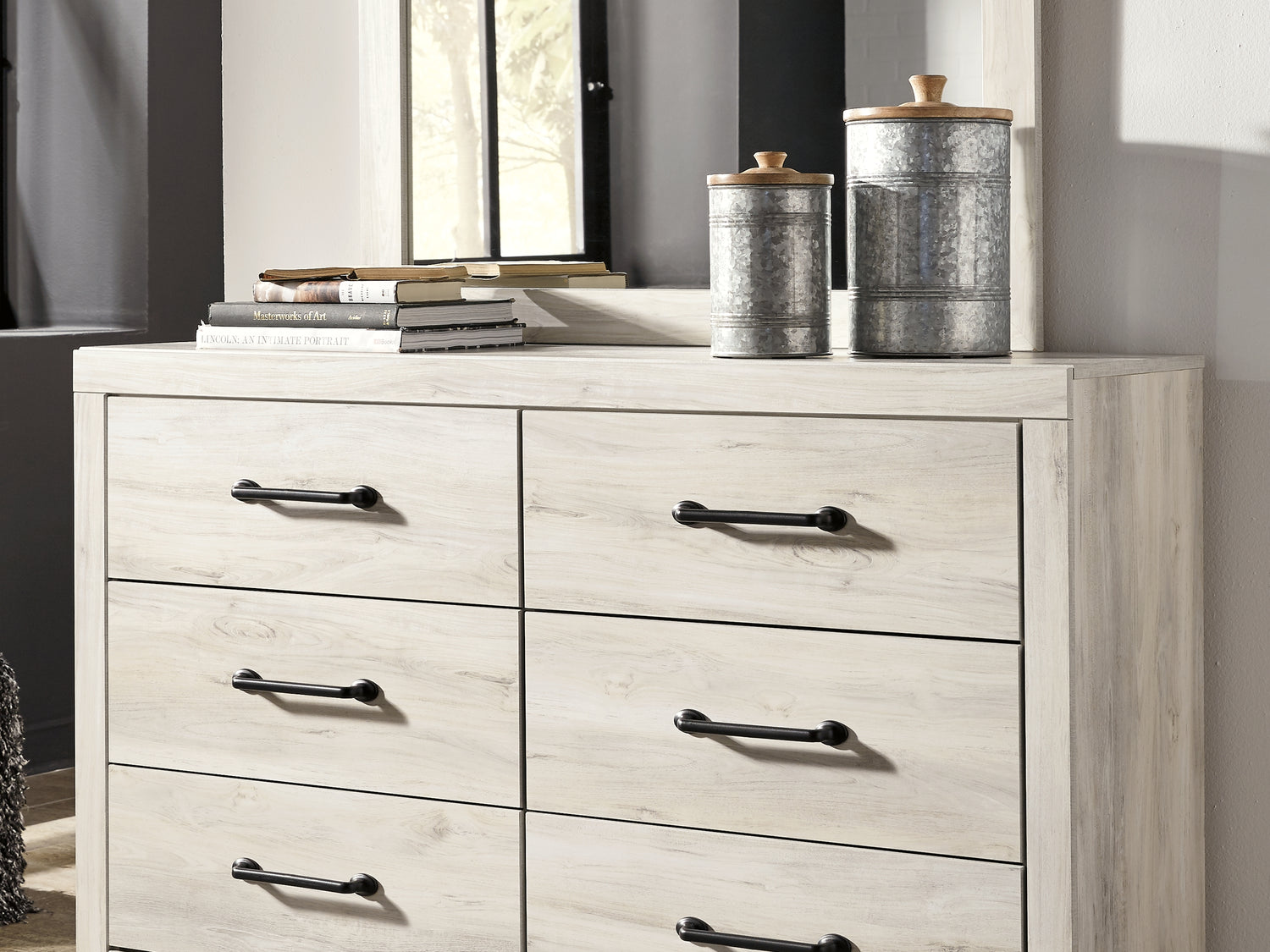 Series Features: Wispy white finish over replicated Oak grain with authentic touch. Large scaled dark colored handles. Cases feature a framed front and pilasters. All panel headboards (53,57,58,87) feature decorative matte black sconce lights. Side roller glides for smooth operating drawers. All panel headboards (53,57,58,87) can attach to a bolt-on metal bed frame B100-31 or B100-66 respectively. Drawers lined with a faux linen laminate for a clean, finished look. Slim profile dual USB chargers located on the back of the night stand top and the side of the headboards. All side storage options (50,150,60,160) requires the use of the B100-11, B100-12, B100-13 or the B100-14 roll slats. All under bed storage units (50,150,60,160) accommodates to 11"W x 11"D x 11"H cube storage bins. All beds have a panel footboard (84,54,56) and storage footboard option (84S,54S, 56S). Panel headboards (53,57,58,87) can attach to a bolt-on metal bed frame B100-31 or B100-66 respectively. Safety is a top priority, clothing storage units are designed to meet the most current standard for stability, ASTM F 2057 (ASTM International). Drawers extend out to accommodate maximum access to drawer interior while maintaining safety.