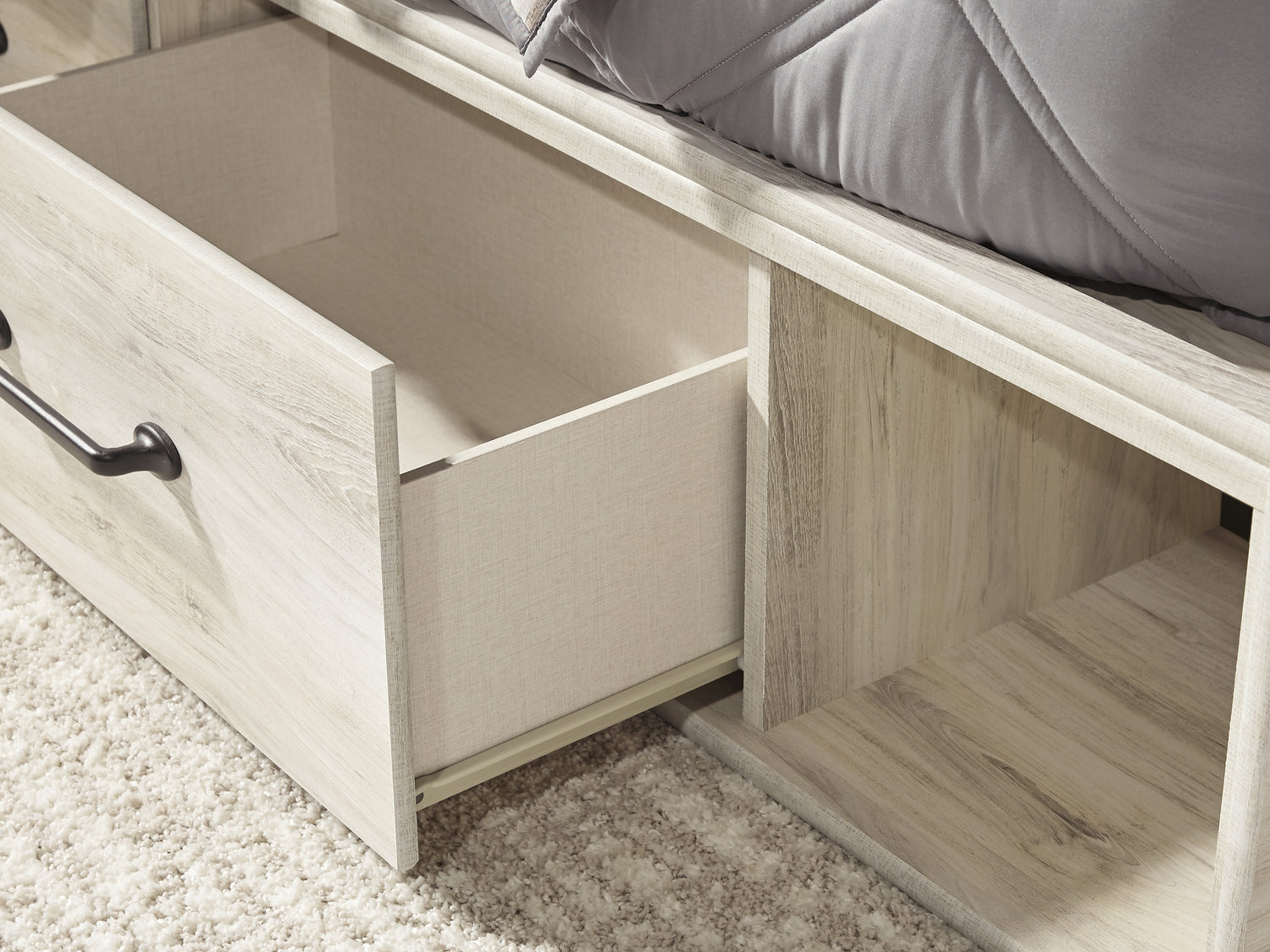 Series Features: Wispy white finish over replicated Oak grain with authentic touch. Large scaled dark colored handles. Cases feature a framed front and pilasters. All panel headboards (53,57,58,87) feature decorative matte black sconce lights. Side roller glides for smooth operating drawers. All panel headboards (53,57,58,87) can attach to a bolt-on metal bed frame B100-31 or B100-66 respectively. Drawers lined with a faux linen laminate for a clean, finished look. Slim profile dual USB chargers located on the back of the night stand top and the side of the headboards. All side storage options (50,150,60,160) requires the use of the B100-11, B100-12, B100-13 or the B100-14 roll slats. All under bed storage units (50,150,60,160) accommodates to 11"W x 11"D x 11"H cube storage bins. All beds have a panel footboard (84,54,56) and storage footboard option (84S,54S, 56S). Panel headboards (53,57,58,87) can attach to a bolt-on metal bed frame B100-31 or B100-66 respectively. Safety is a top priority, clothing storage units are designed to meet the most current standard for stability, ASTM F 2057 (ASTM International). Drawers extend out to accommodate maximum access to drawer interior while maintaining safety.