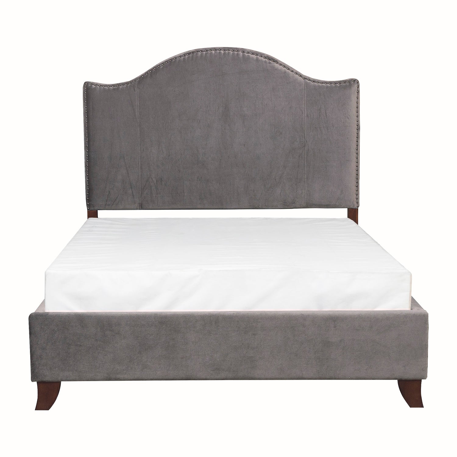 The carlow collection was designed to have a look that is both modern and historic at the same time. in order to further the appearance of a traditional bed, the camelback headboard features nailhead trim along its profile. the eastern king bed in your bedroom has been outfitted with a fabric in a charcoal gray velvet for a plush and sophisticated look.