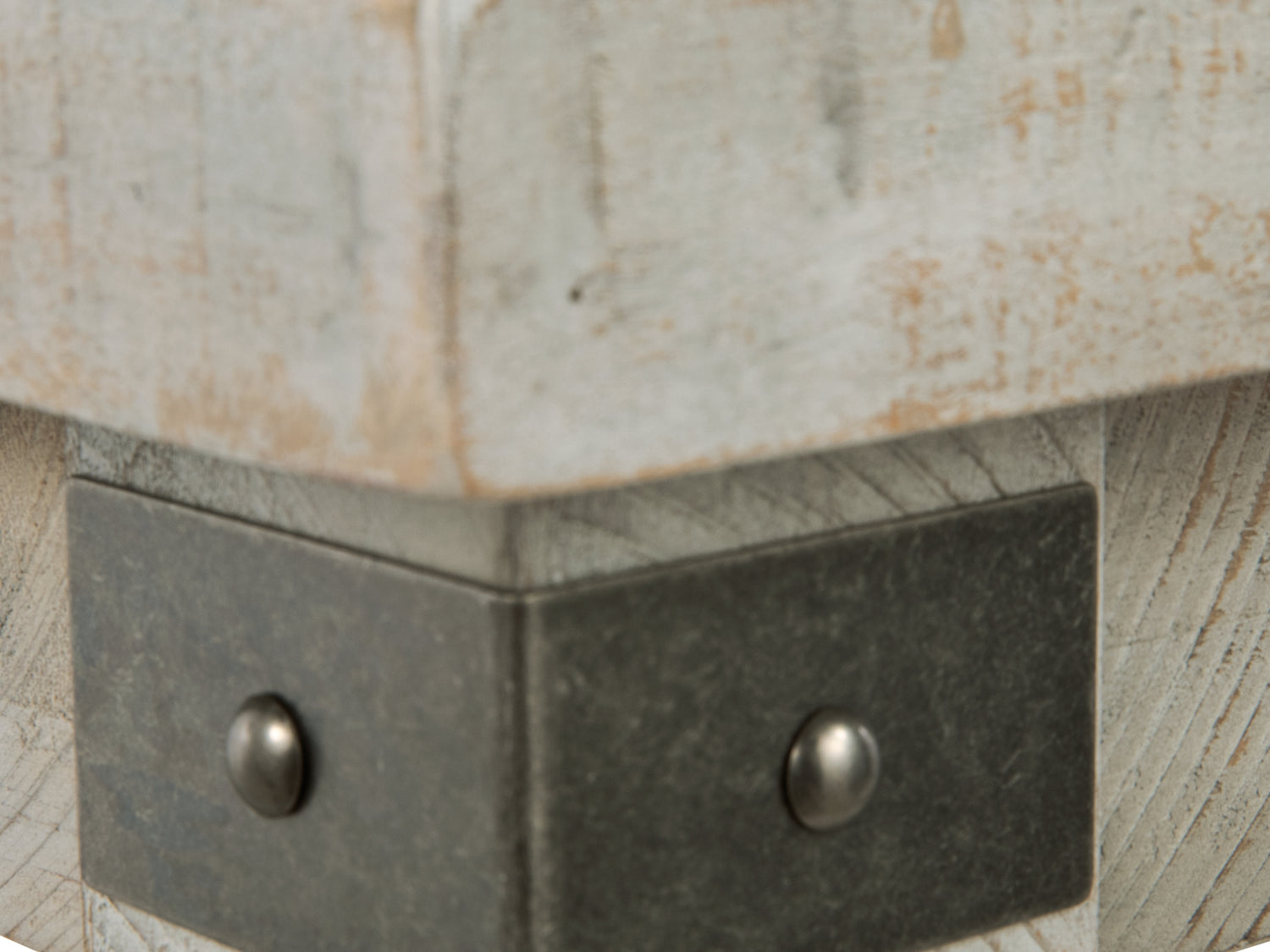 Series Features: Made with reclaimed Pine solids and finished in a weathered whitewash finish with nail holes, patches, dings and gouges. Antique storage trunk inspired, this set has a generously scaled lift top cocktail table. Metal bracket details and large recessed bun foot, with planked and butcher block wood effect. Inside of cocktail table is fully finished to provide a large storage cavity. End tables have large stock legs, large base shelf and metal bracketing.