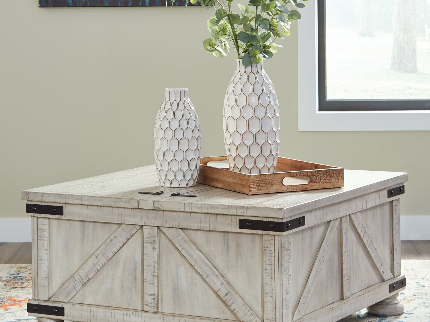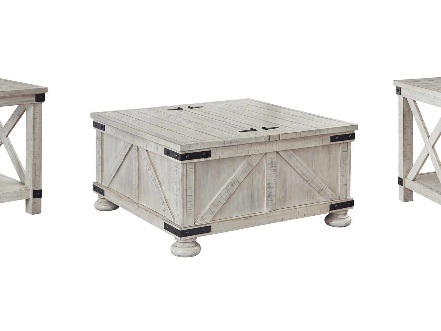 Series Features: Rustic Farmhouse design. Made with pine solids and veneers with engineered wood substrate. Distressed whitewashed finish. Stylish cross-buck details and metal bracket appliques. Dual lids on the cocktail table are designed for easy access to the large capacity storage area.