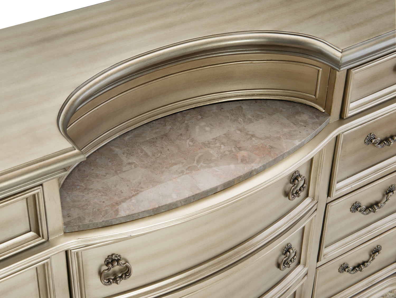 The cavalier collection is an excellent example of the best that old world european style has to offer as a source of inspiration. an egg and dart base molding, a bead molding, acanthus leaf carvings, and a genuine marble inlay top all work together to produce a beautiful complement for any classic bedroom. the silver finish that is applied to the birch veneer of the dresser draws attention to the dresser's many lovely elements.