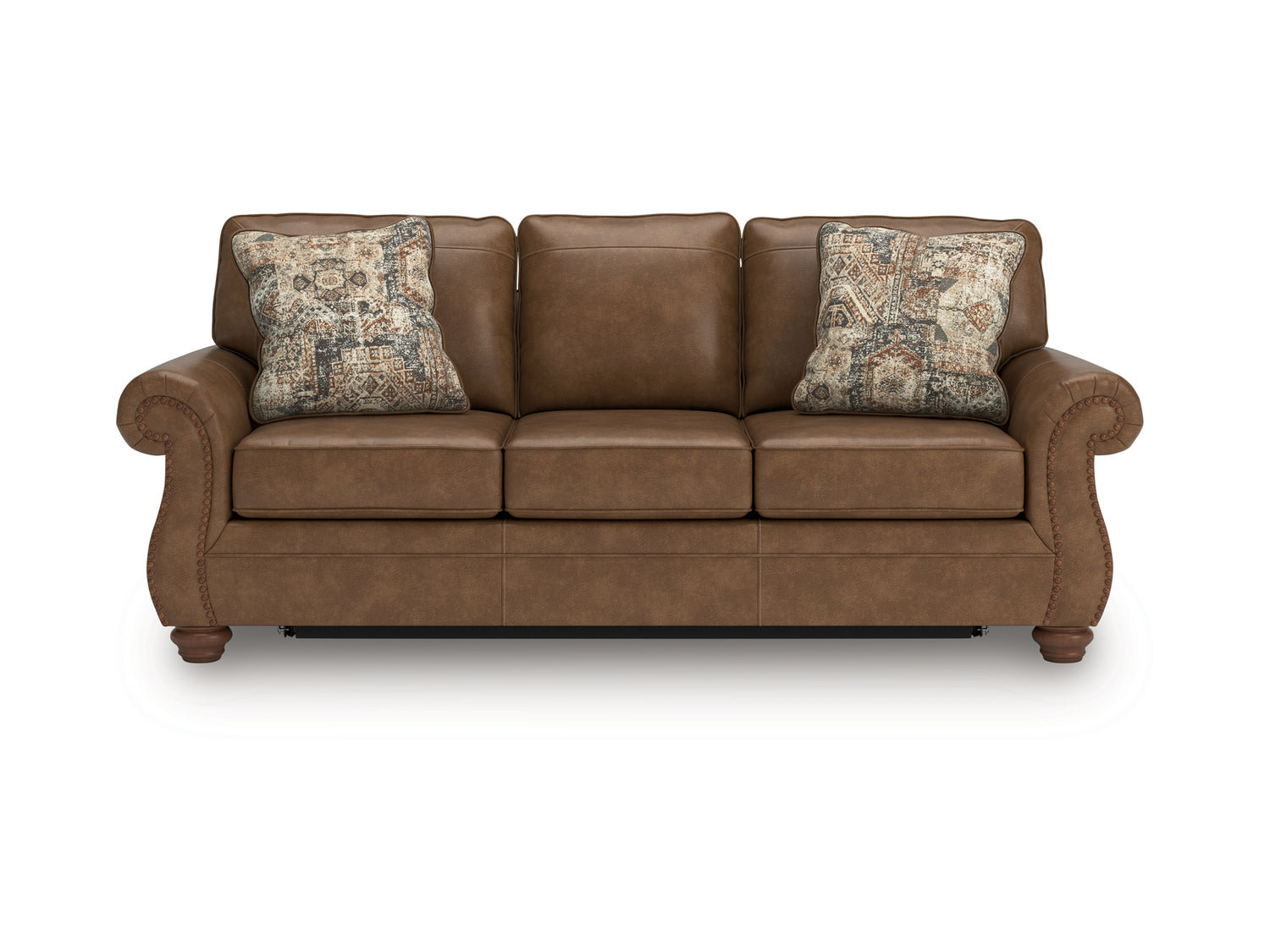Series Features: Traditional styled roll arm, upholstered in a sophisticated heavyweight faux leather with an amazing had and outstanding durability. Featuring a distressed, motif pattern jacquard chenille pillow in warm earth tones. Loose reversible cushions and attached boxed back. Accented with decorative turn legs and nail head detail on arms.