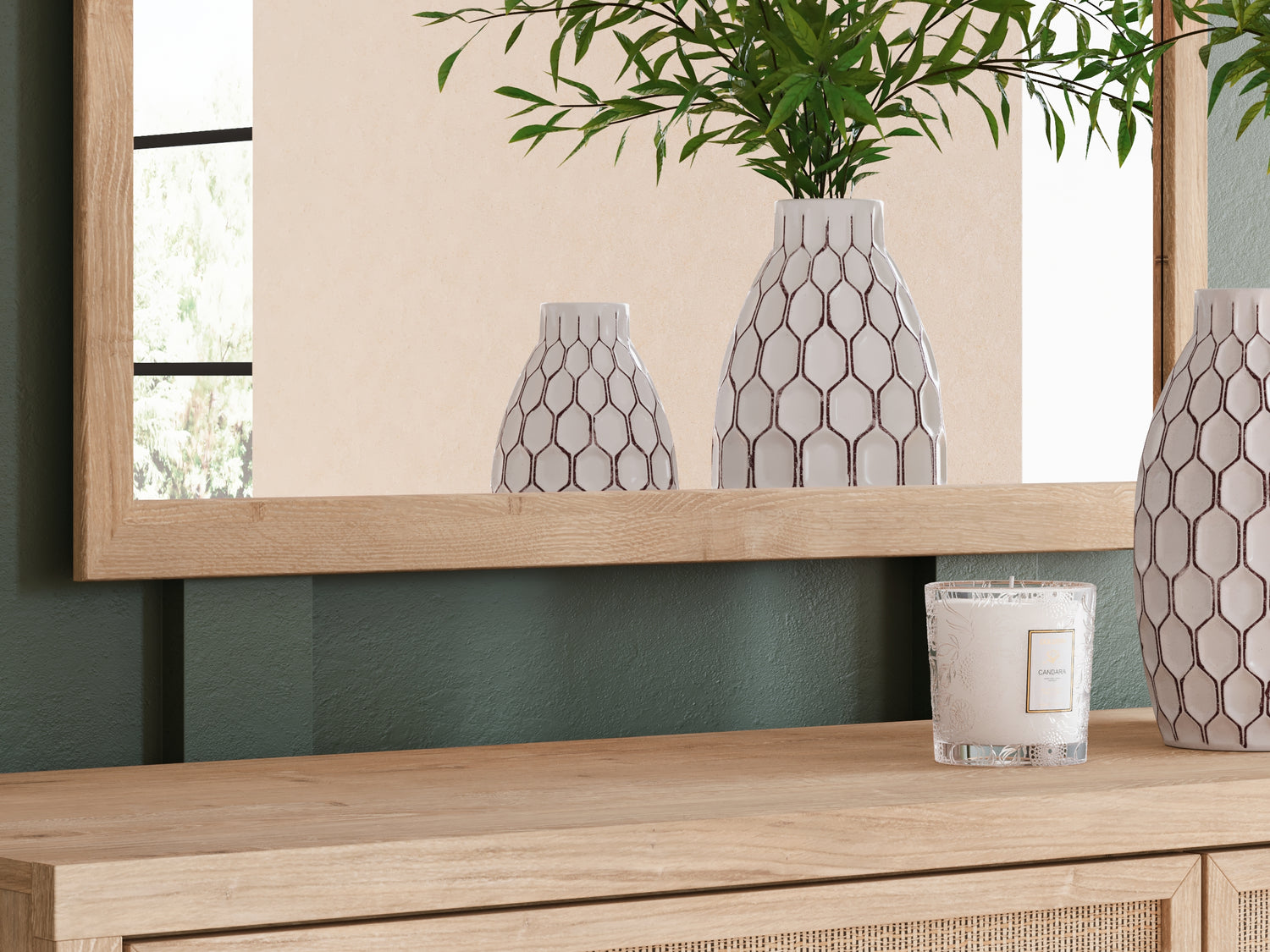Series Features: A mix of materials with dry, light finish with replicated oak grain and authentic touch and a replicated beige cane finish. Cases feature a framed front and pilasters, framed drawers with cane fronts and bronze color knob. Side roller glides for smooth operating drawers. Drawer interiors finished with a replicated linen design. Both USB and wireless charging options are provided with the nightstands. Nightstand is equipped with warm LED lighting at the base, offering three levels of brightness controlled by a touch button for a serene bedtime ambiance. Footboards (154,156,184) require the B100-12, B100-13 or B100-14 roll slats. Full (87), Queen (57) and king (58) headboards can attach to a bolt-on metal bed frame B100-21, B100-31 or B100-66 respectively. Mirror (36) has the versatility to be mounted on dresser or wall horizontally or vertically. Safety is a top priority, clothing storage units are designed to meet the most current standard for stability, ASTM F 2057 (ASTM International). Drawers extend out to accommodate maximum access to drawer interior while maintaining safety. Minor assembly required.