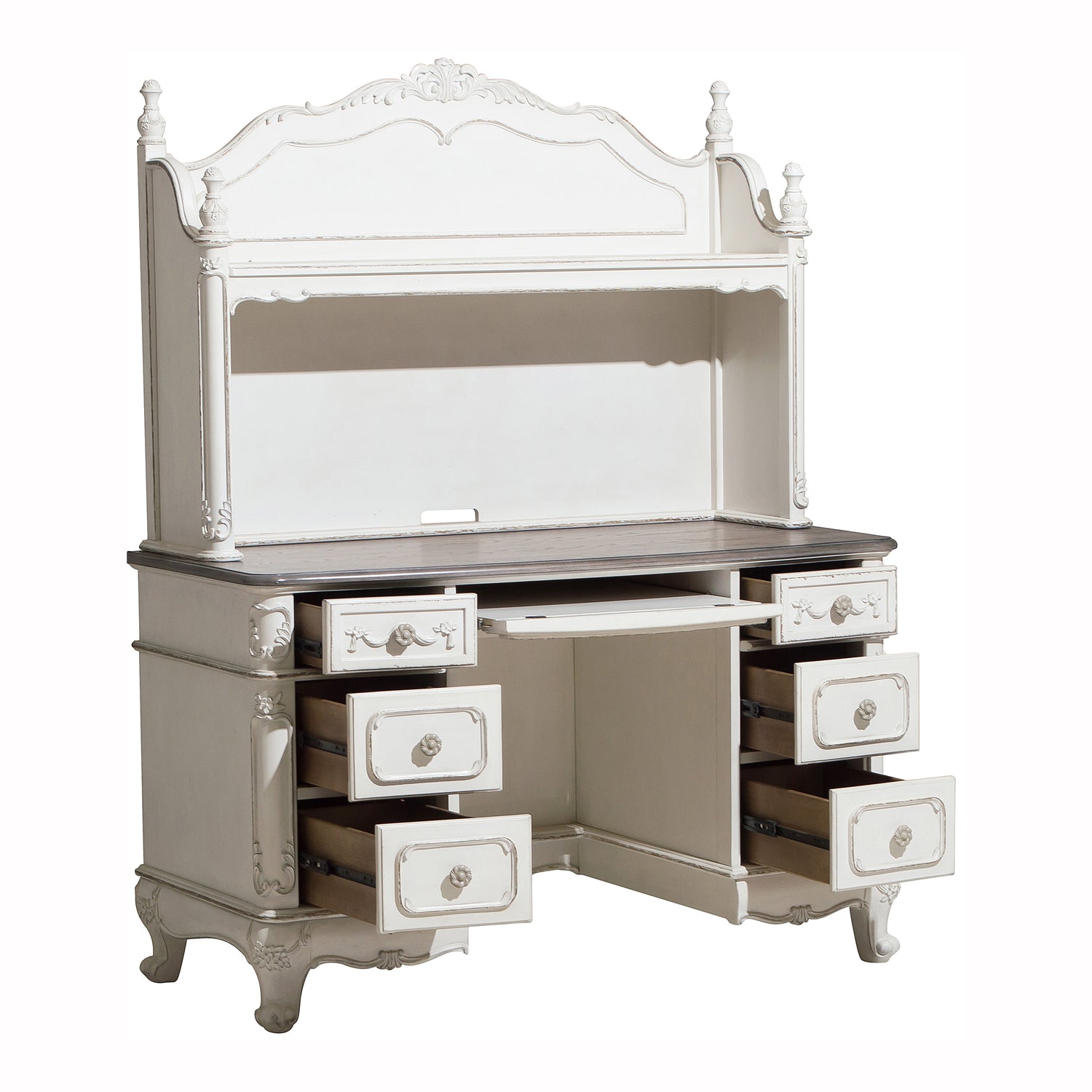 The cinderella collection is the realization of a childhood fantasy for your young daughter or son. on the white with gray rub-through polished desk hutch, the victorian styling integrates flower pattern hardware and traditional carving features, which will provide the impression of stepping into a fairy tale. display and storage of desk accessories are both possible thanks to the built-in shelves. in addition, you can select from daybeds, twin canopy poster beds, full canopy poster beds, twin beds, full beds, and queen beds, as well as chests, mirrors, nightstands, tv armoires, lingerie chests, dressers, desks, and desk chairs.